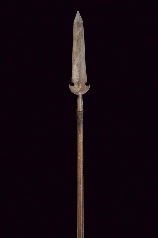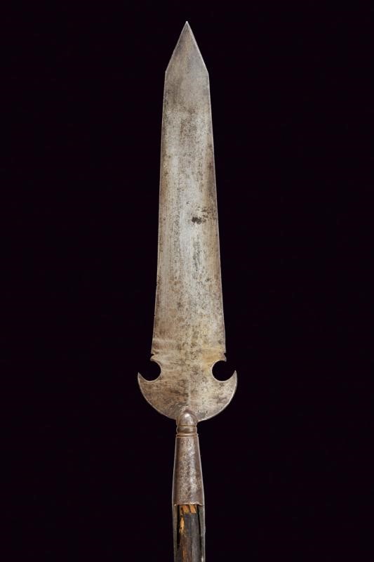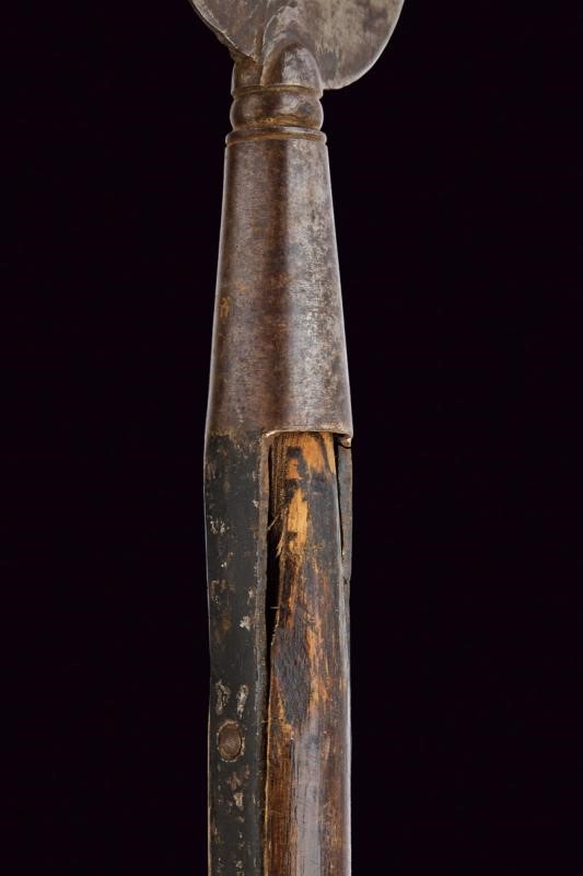 Wide, flat, iron cusp, with crescent-shaped wings at the base; ferrule shaped as a truncated cone, with flat straps probably shortened on a modern wooden shaft. Used by papal guards.