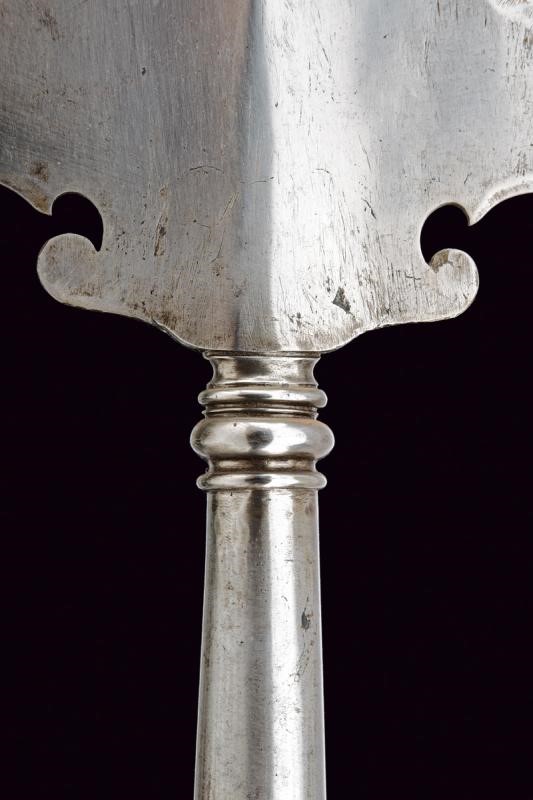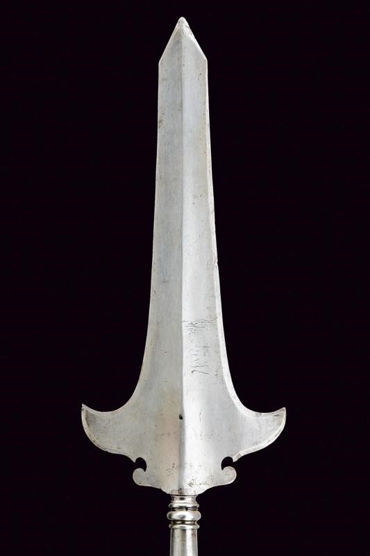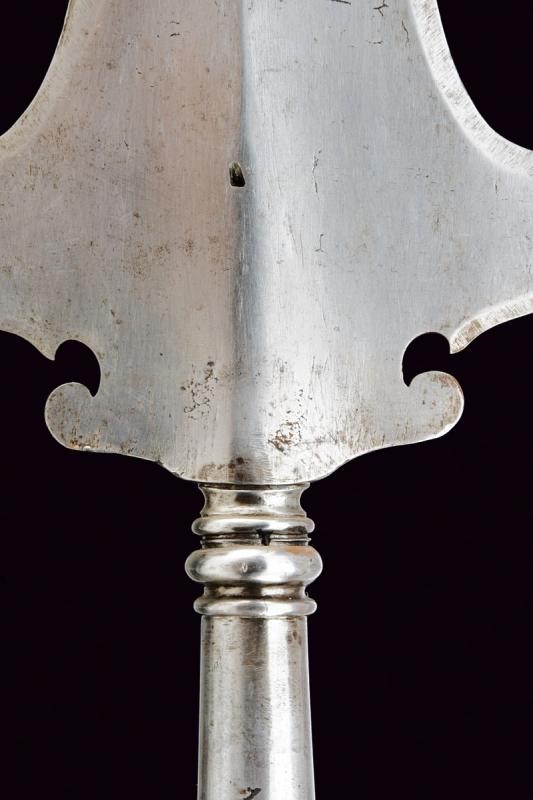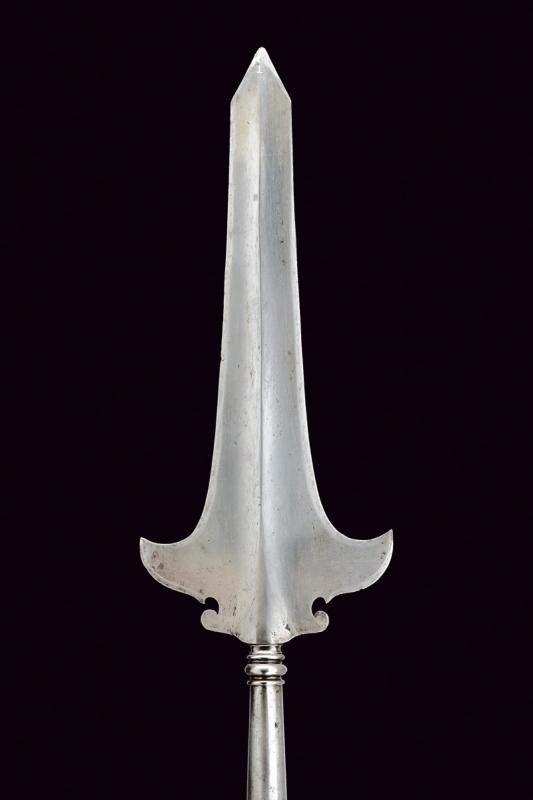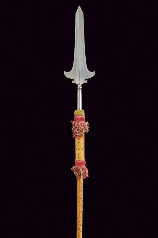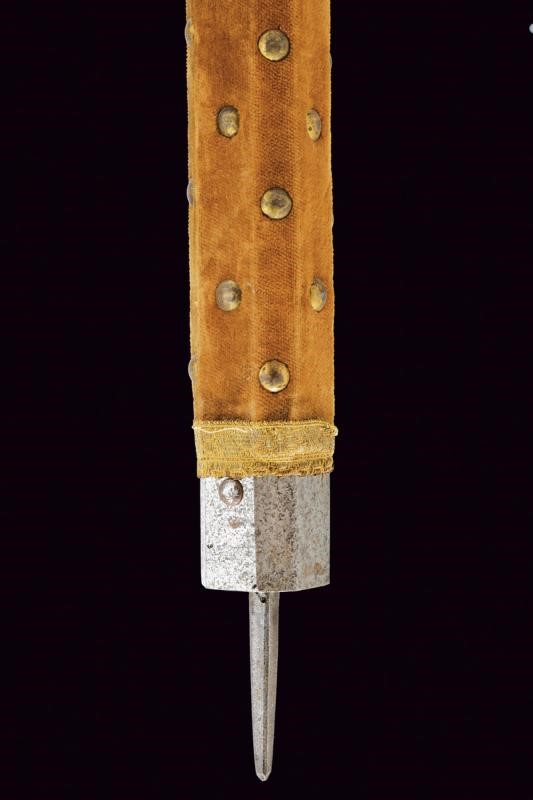 Large spearhead with a cusp-blade ribbed in the middle, the wings provided with two well-pronounced lobes at the bottom. Some cracks on one side. Ferrule shaped as a truncated cone with a nicely twisted knot. The entire shaft is covered in mustard-coloured velvet (from the beginning of the century?), the upper segment is thickened and has two tassels. Iron shoe, with cusp.