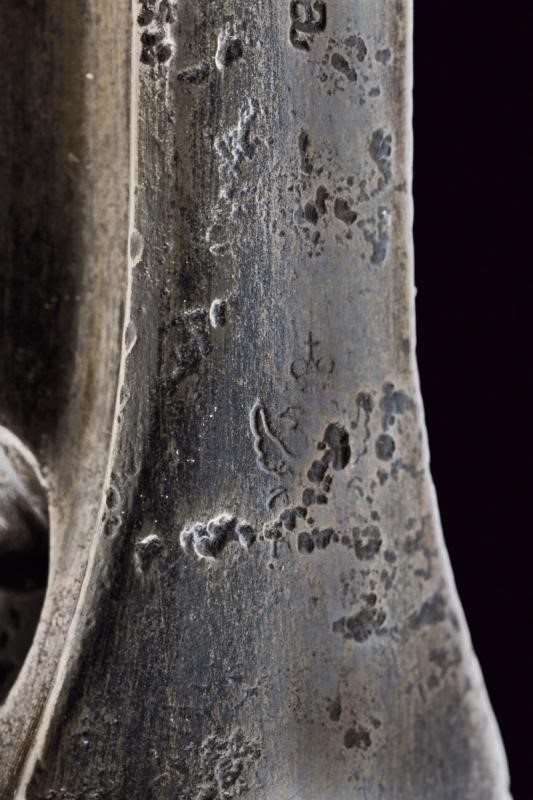 Round, 8", round, rifled barrel (visible fouling, some internal encrustation that needs cleaning). Rib marked with maker’s name and Springfield address in Cyrillic, ending with remains of a double-headed eagle mark. Caliber .44 Russian. Six-shot cylinder, working mechanism and extractor (first snap does not hold; firing pin with restoration). Serial number “180xx” matching on barrel, trigger guard, cylinder, and grip frame. Cylinder featuring a circled “D” proof mark; with Cyrillic inspection stamp under the grip. Smooth wooden grips with signs of use and time. Some pitting, signs of use and time. Complete with loop.