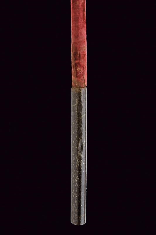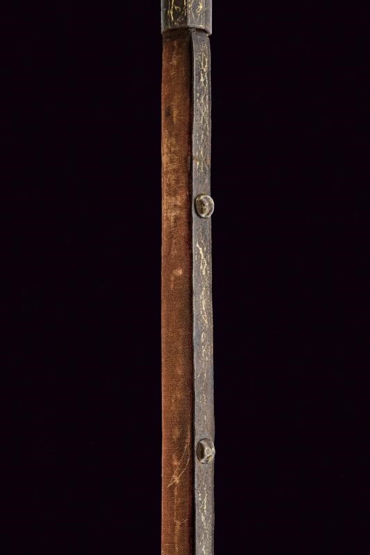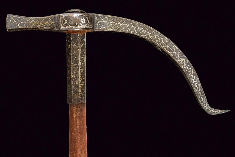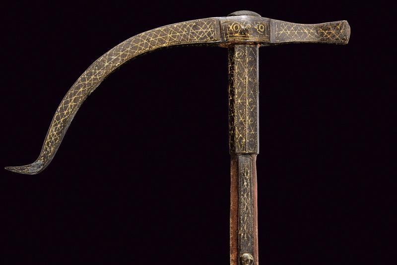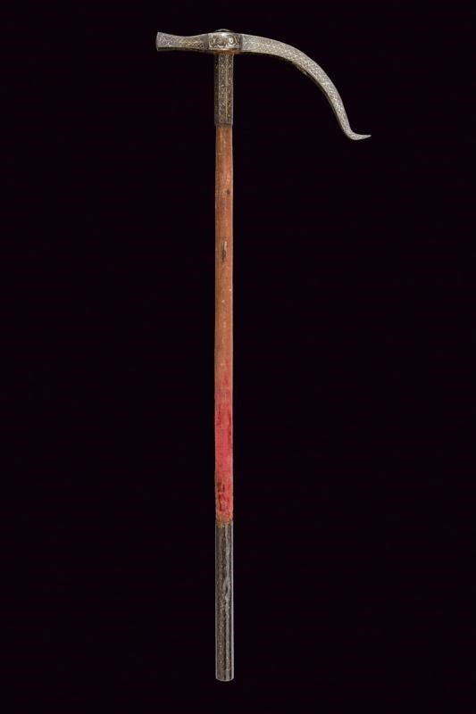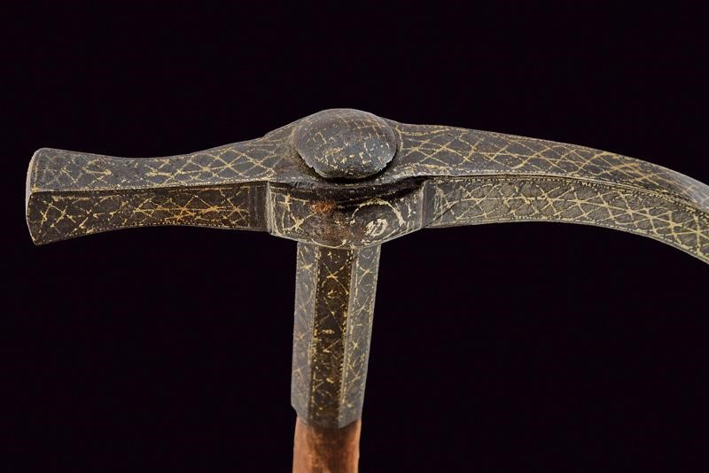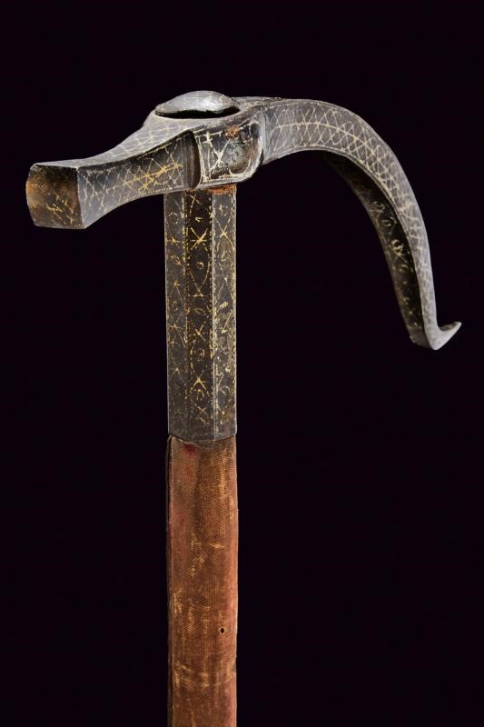 Iron head with long, curved beak of rectangular section with counter-curved end, the hammer of square section enlarged at the end. Convex centre of crossguard. Octagonal ferrule, wooden shaft covered with burgundy velvet (completely worn), the cylindrical iron handle joined with a band at the ferrule (one rivet is missing). All the iron parts with gold geometric decoration (missing parts). Rare.