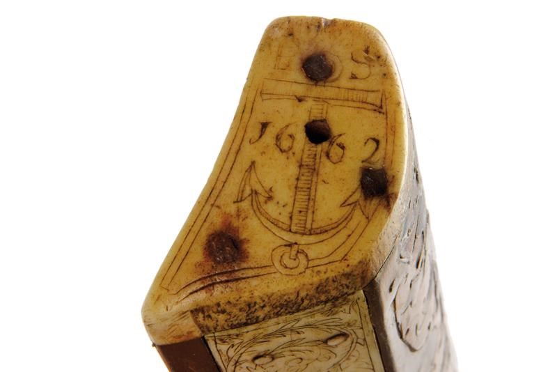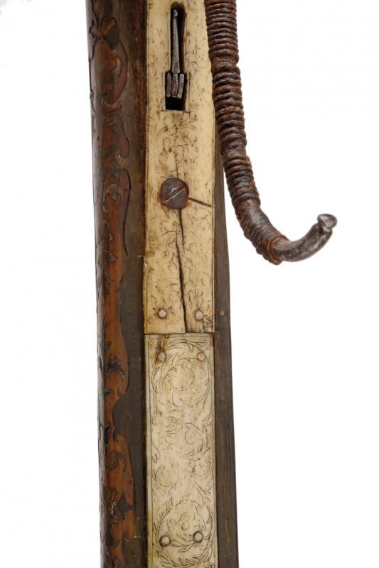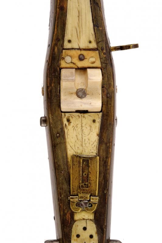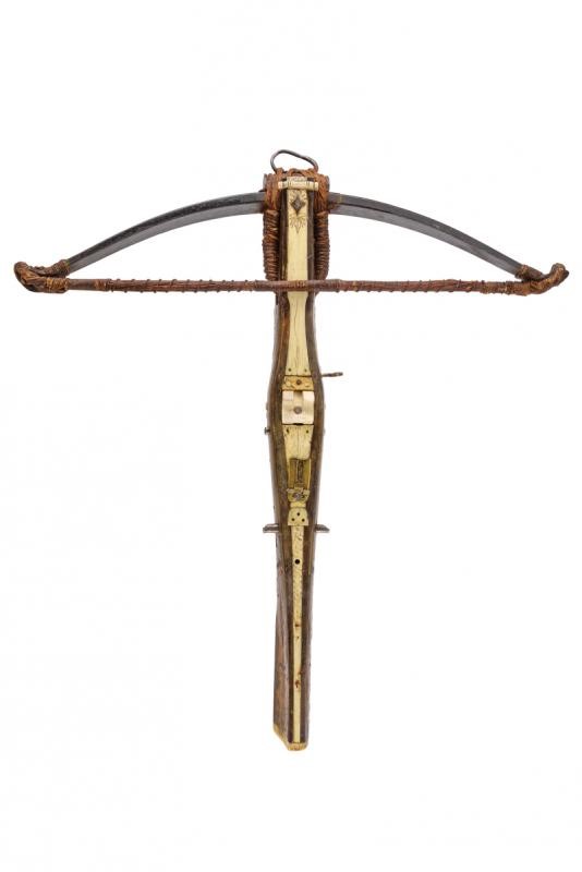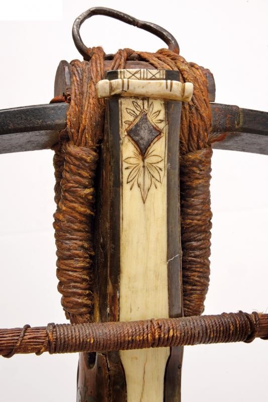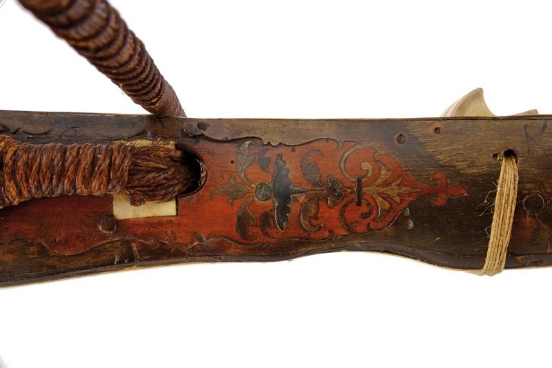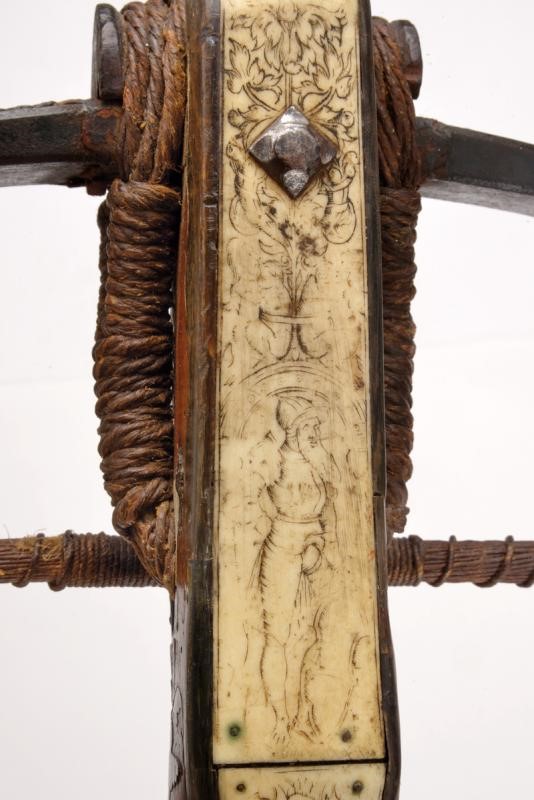 Wooden tiller of typical shape, thickened in the centre. Decorated with plates and cow-horn inlaid floral motifs on the sides. The upper plate and the one covering the lower side are both made of white horn plates featuring engraved floral and geometrical motifs (not clearly visible); the lower ones also feature a beautiful depiction of a knight in armour. Bone pommel depicting an anchor with the date “1662”. The nut (probably replaced during use) and an adjustable brass peep sight are present. On the sides there is a cylindrical iron crossed bar for the pocket gun. Circular stirrup with damaged parts. Thick iron bow. The bowstring is not recent, complete with tensioner. Foldaway trigger. Large countercurved iron hand guard provided with a string.