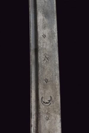 Curved, single-edged blade with fuller on the back, base decorated with stars and crescent; iron hilt with loop turned towards the grip and guard. Typical wooden grip, slightly curved and thickened at the top.