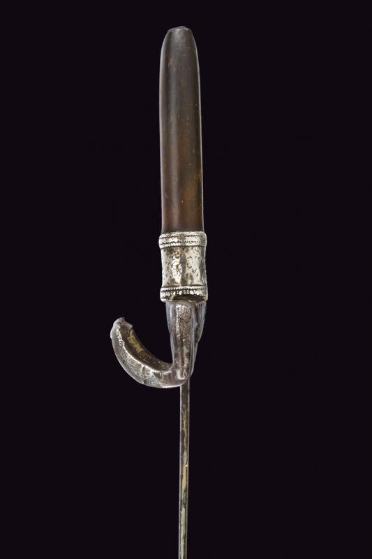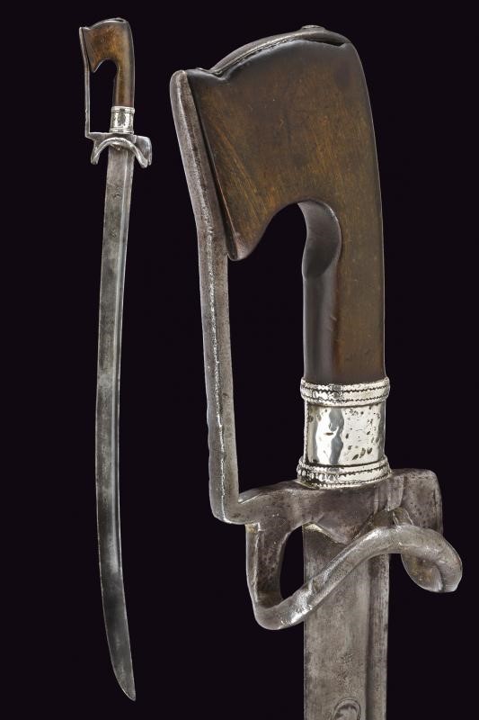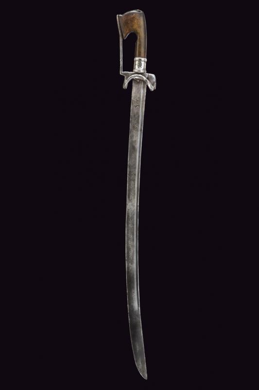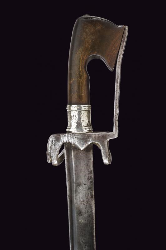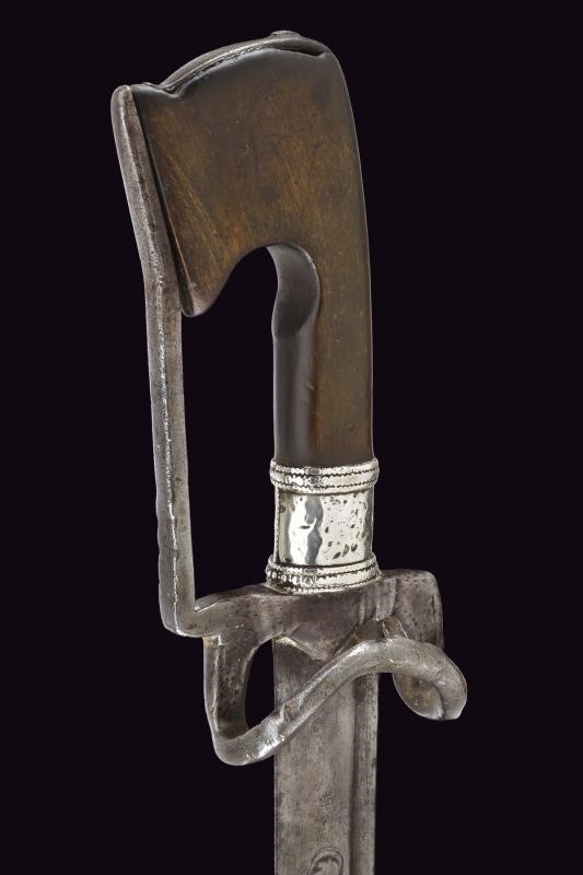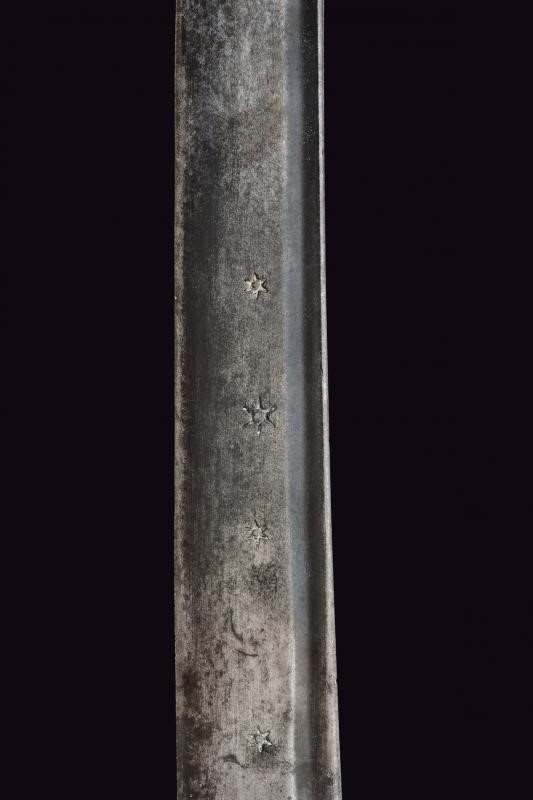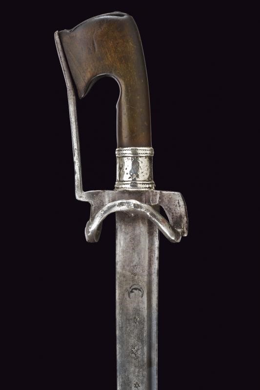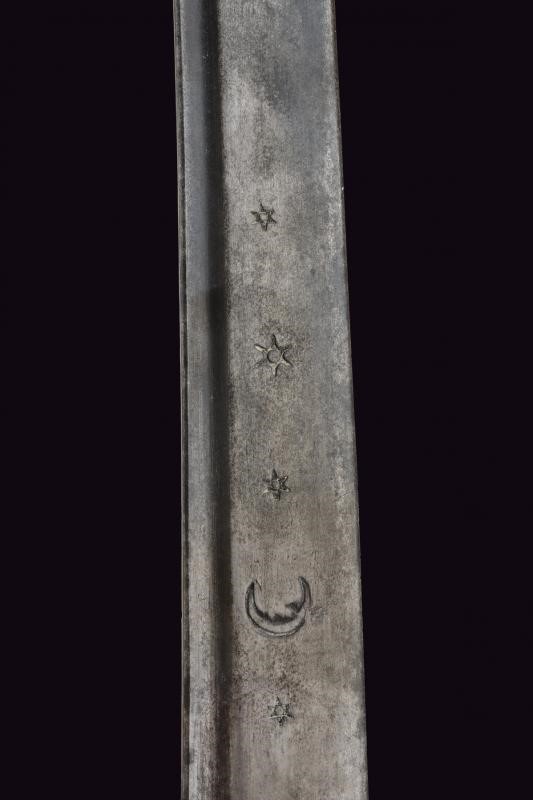 Curved, single-edged blade with fuller on the back, base decorated with stars and crescent; iron hilt with loop turned towards the grip and guard. Typical wooden grip, slightly curved and thickened at the top.