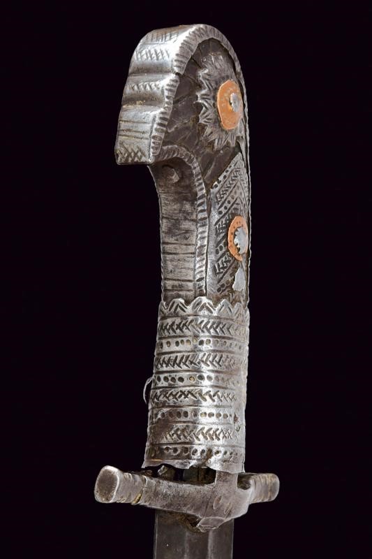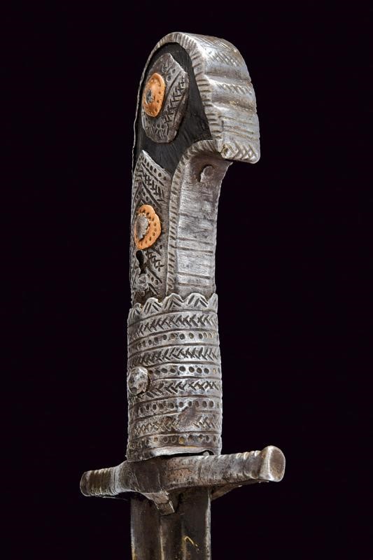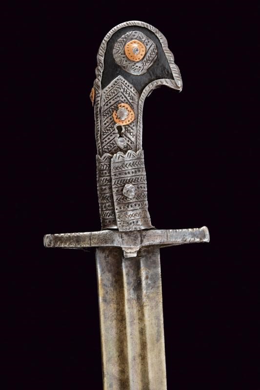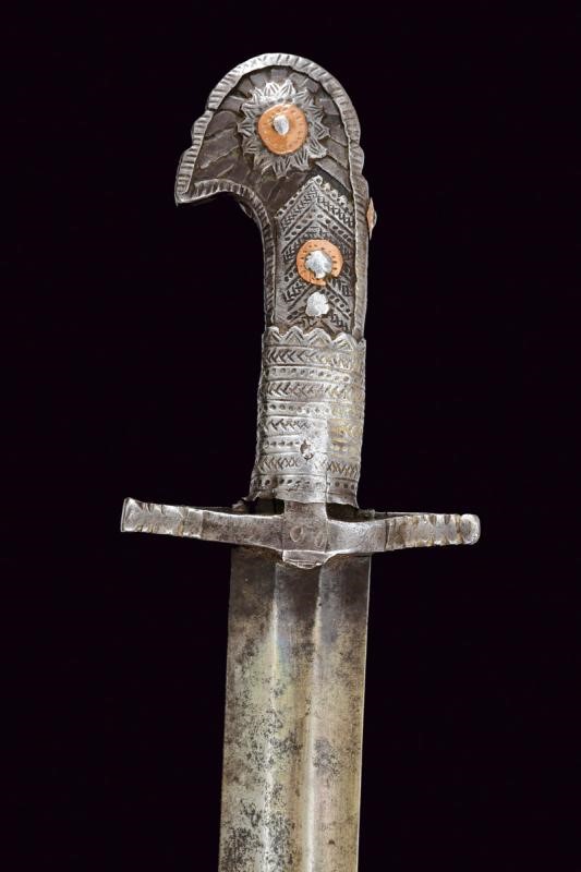 Slightly curved blade with two grooves, later tripled; rounded tip. Grip made of wood with iron mounts engraved with geometric motifs; pommel shaped as a stylised bird's head.