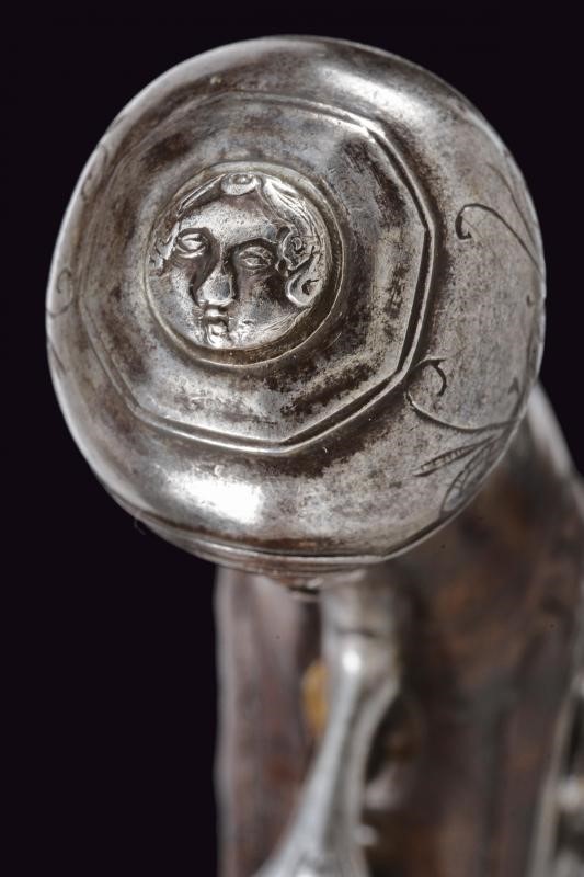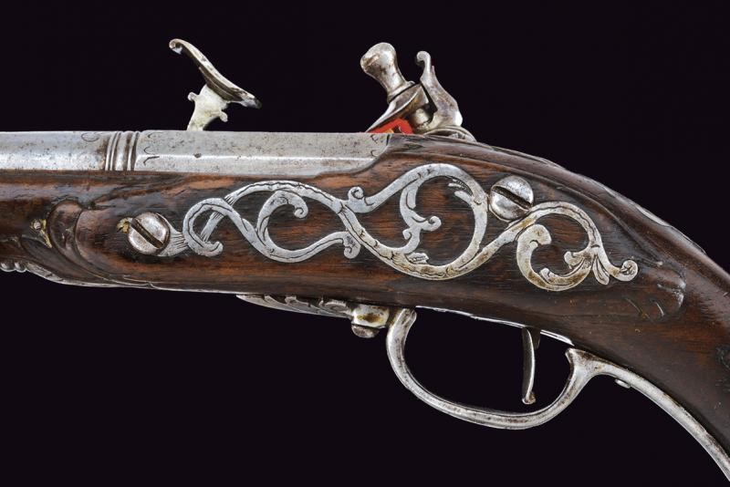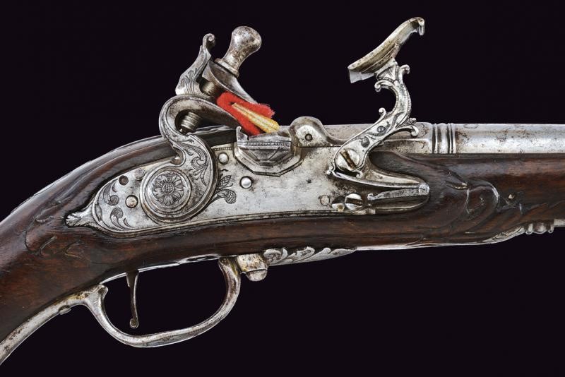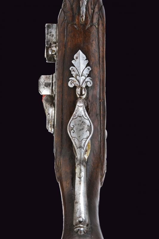 Smoothbore, two-stage, 9 mm cal. barrel, octagonal at the first part, then round and slightly angled on the back; both segments engraved at the ends. Flintlock, lock plate with slightly swallow-tailed tang; cock and batterie engraved with floral motifs. Wooden full stock; with engraved and partially pierced mounts; the butt with a shield depicting two mirror-image birds on the back. Iron ramrod.