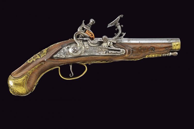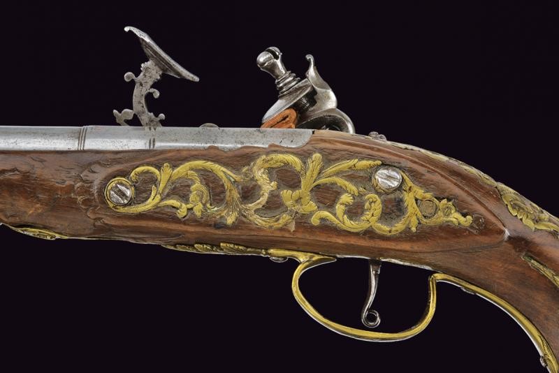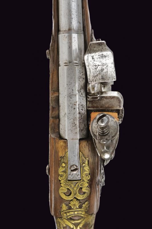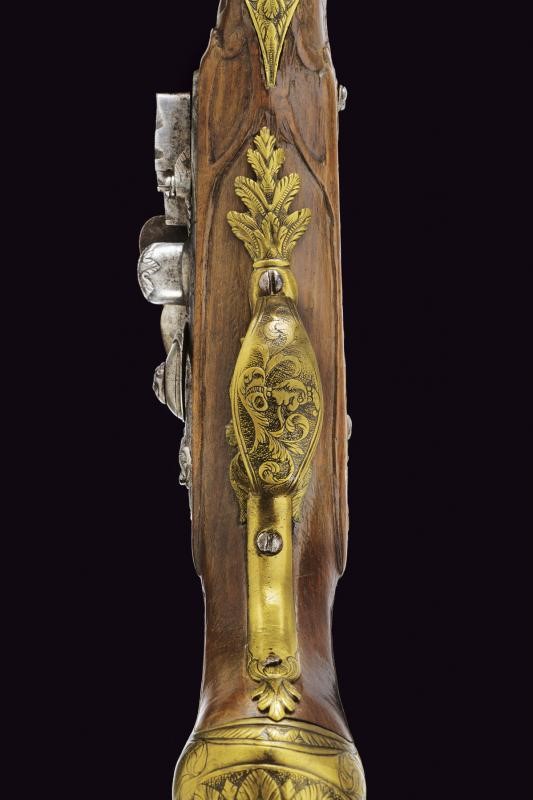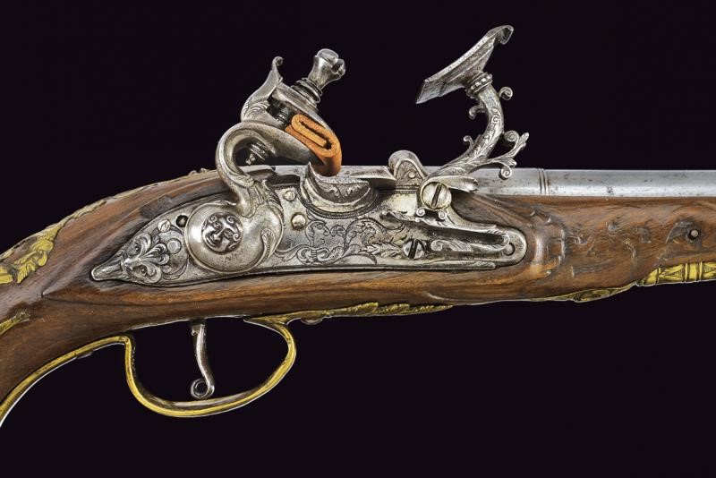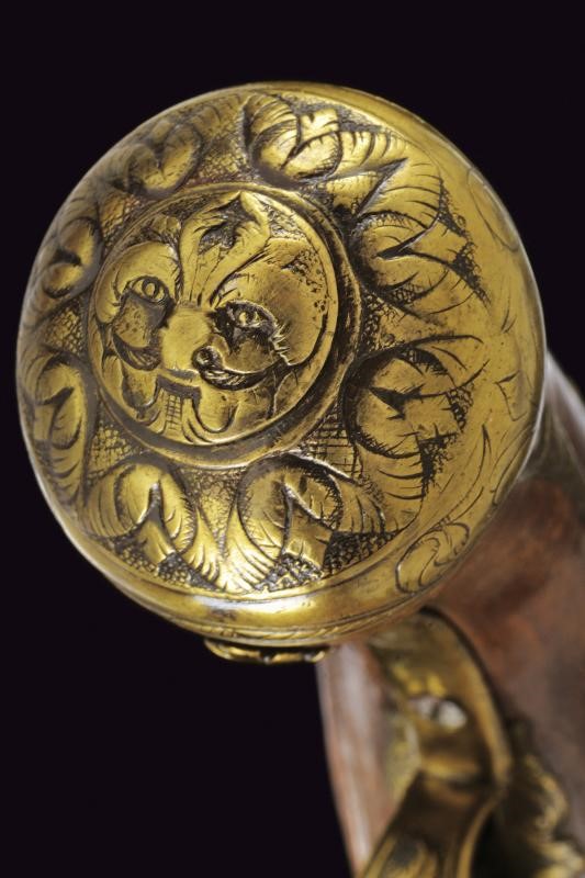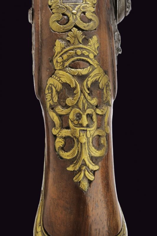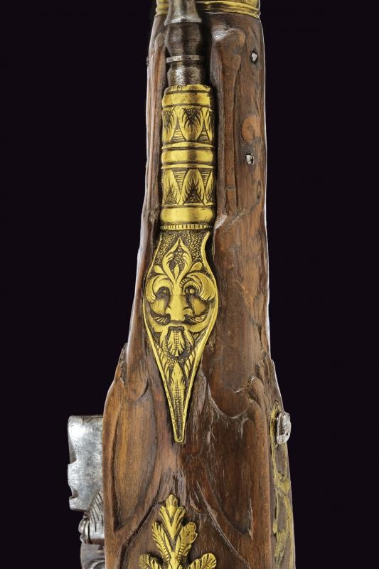 Smoothbore, three-stage, 11,6 mm cal. barrel, the first octagonal, then a sixteen-sided segment, and finally of round section; snaphaunce flintlock, lock plate slightly rounded, in the centre of the plate engraved with spirals and a face; at the end, figure with horns in high relief, the cock, pan and grip of the batterie engraved and carved with plant motifs; the screw of the cock with mask. Wooden, full stock, engraved brass mounts, carved and partially pierced with floral and mask motifs. Iron ramrod.