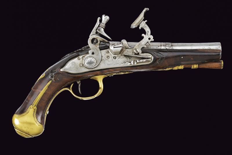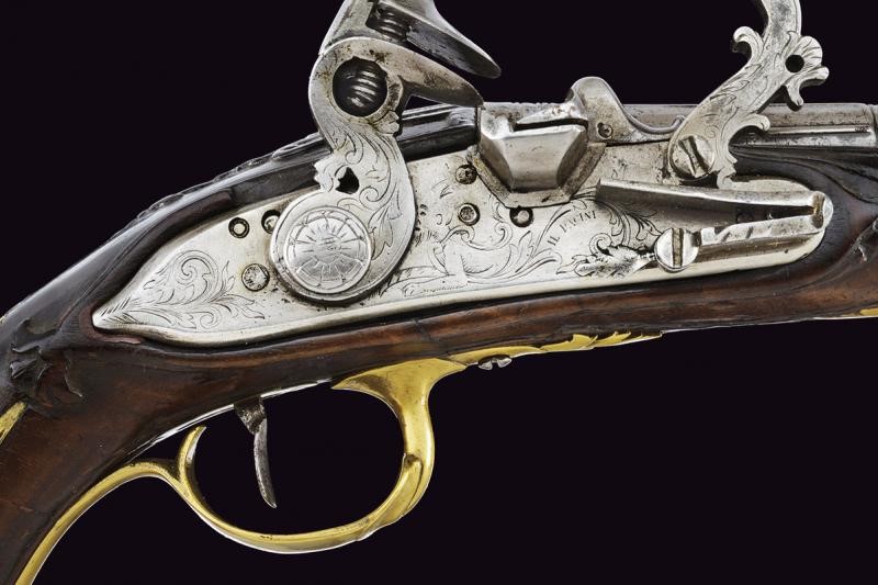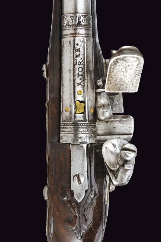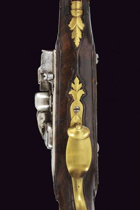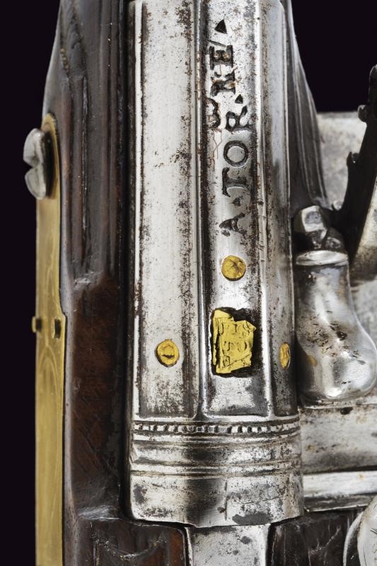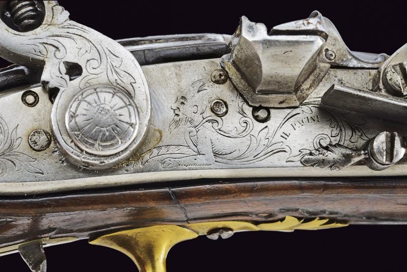 Smoothbore, two-stage, 11.5 mm cal. barrel, of octagonal section marked "PISTOIA" and finished with three semi-spherical fullers, all gold-inlaid, at the first part, then marked "A. TOR.NE" slightly forward, rings at the girdle, one smooth, the other engraved, then of round section. Flintlock, flat plate signed "IL PACINI" and engraved with floral motifs and a mixed anthropomorphic animal figure; sliding pan cover. Wooden full stock (small restoration in the part below the nozzle). Brass mounts, engraved counterplate.