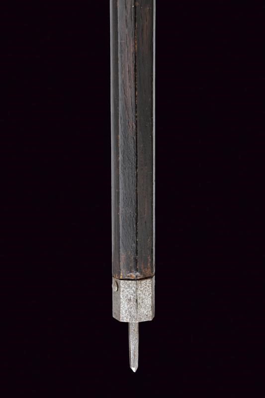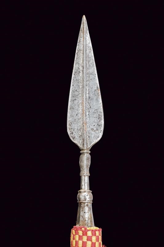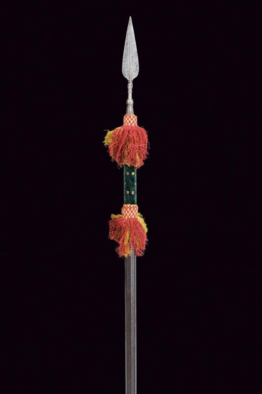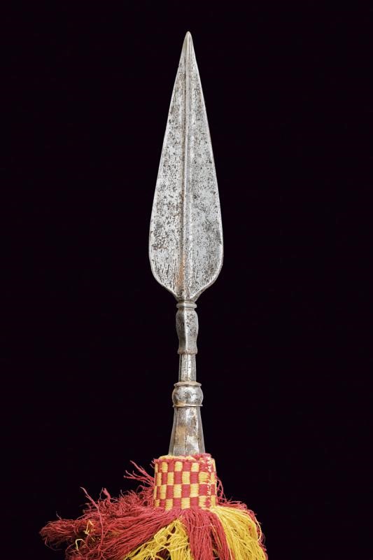 Double-edged leaf-shaped cusp, strongly ribbed in the centre, provided with a square-section knob with a long collar decorated like a baluster, then cylindrical and finally spheroidal, with a faceted ferrule shaped as a truncated cone. The straps are not visible as they are covered by velvet with tassels; the shaft is of much more recent manufacture. With iron shoe.