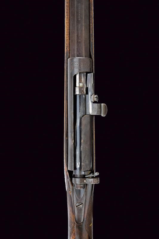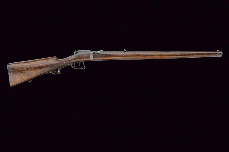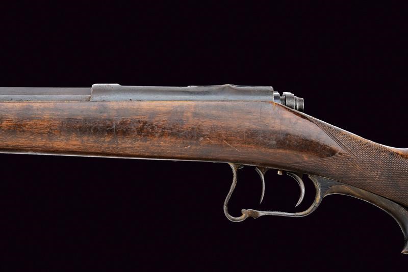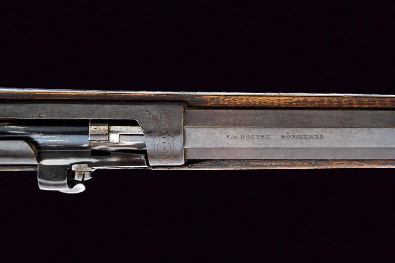 Octagonal, rifled barrel (bore partially dusty which needs cleaning, visible rifling), 10.8 mm cal.at the nozzle; marked "F.V. DREYSE SÖMMERDA" on the back. Fixed foresight and rear sight. Bolt action with frame marked "PATENT". The trigger lever engraved with net. Working mechanism. Working trigger and set trigger. Full stock of walnut wood with checkering at the grip. Iron mounts. The trigger guard with curl and pierced horn tang (small missing part). Some signs of use and time. Remains of probably old browning.