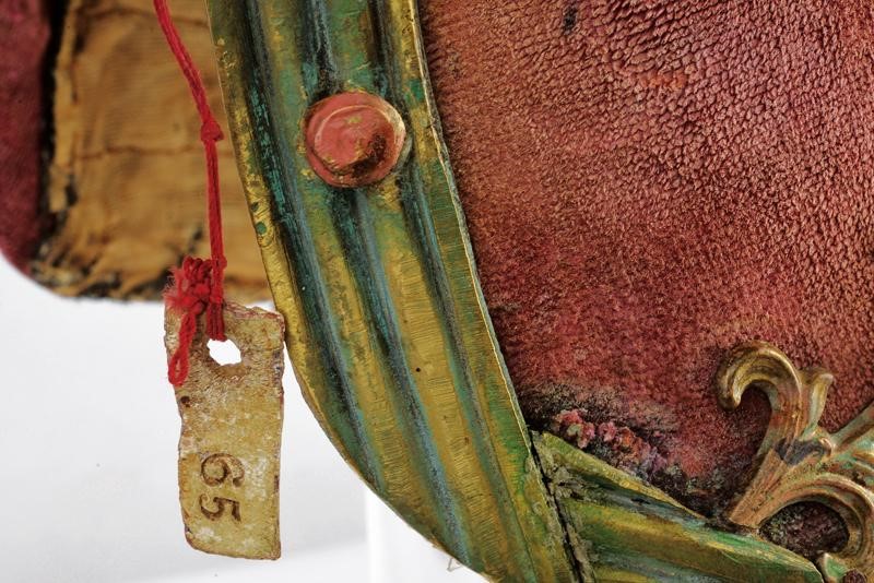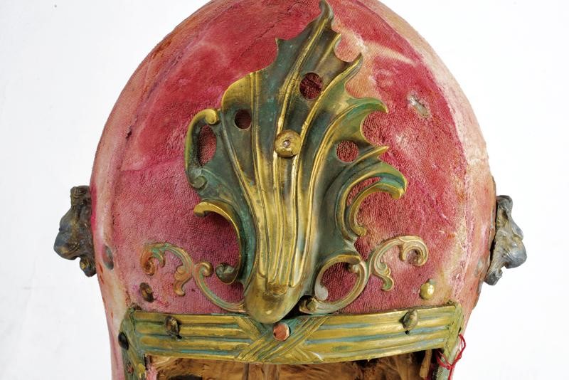 Heavy iron skull in two halves, the outer surface entirely lined in embroidered burgundy velvet fabric (with missing parts and defects), the central part with a large, brass acanthus leaf and borders covered with a brass band with triple grooves, on the sides, on iron rosettes, there is a brass medallion with the lion of St. Mark. In addition to the borders of the front, the side and back are also covered, although smaller, with an internally roped brass band (missing parts), the front with a plume-holder. Inside remains of the white fabric covering.
