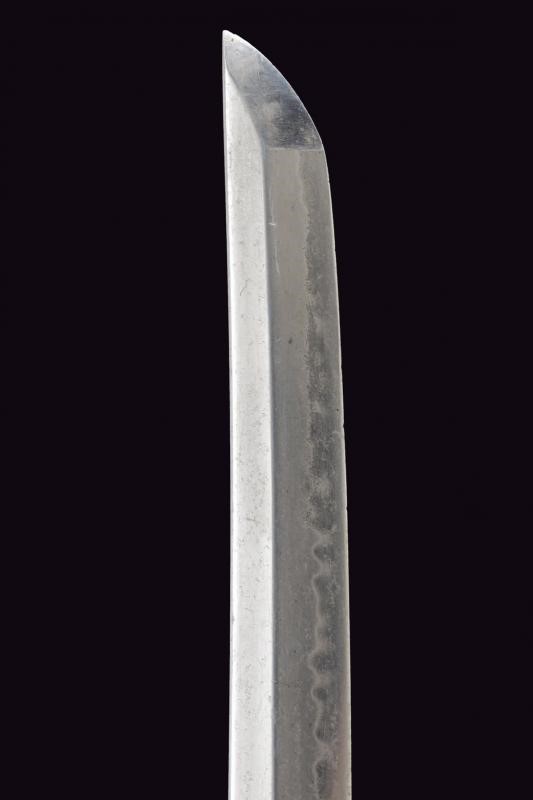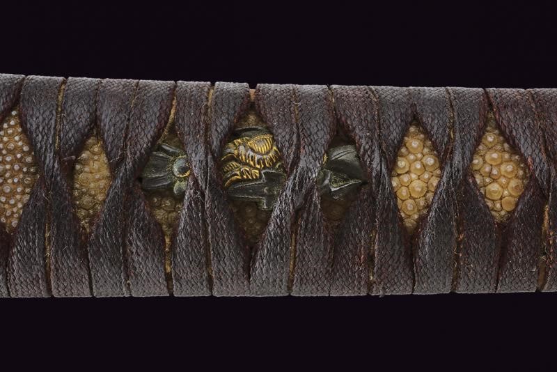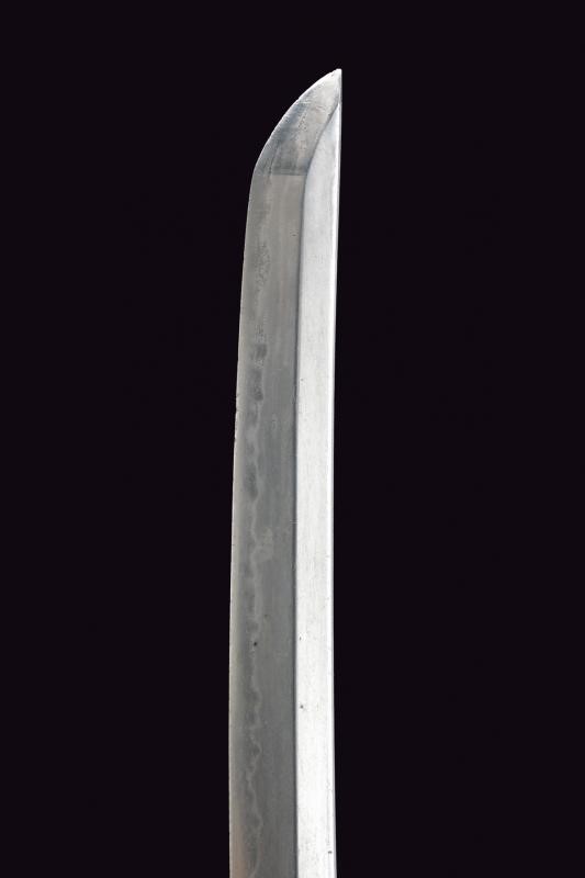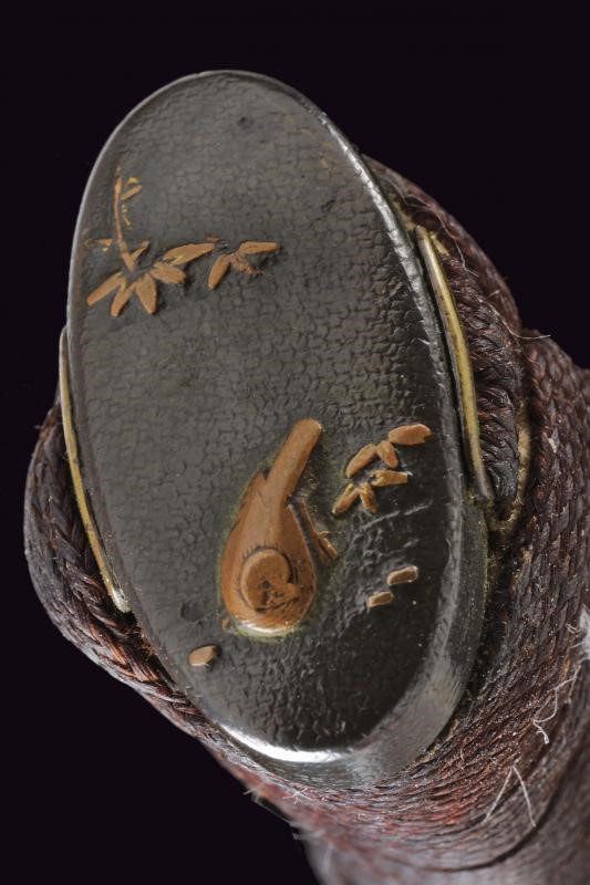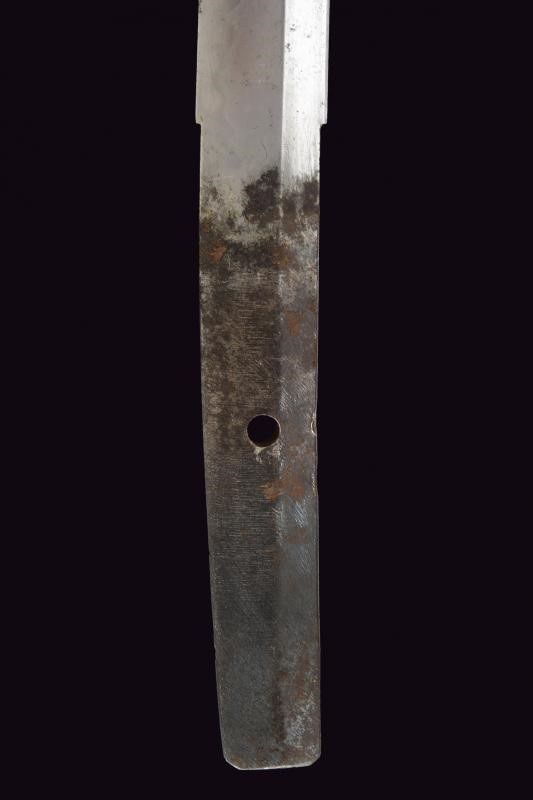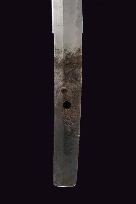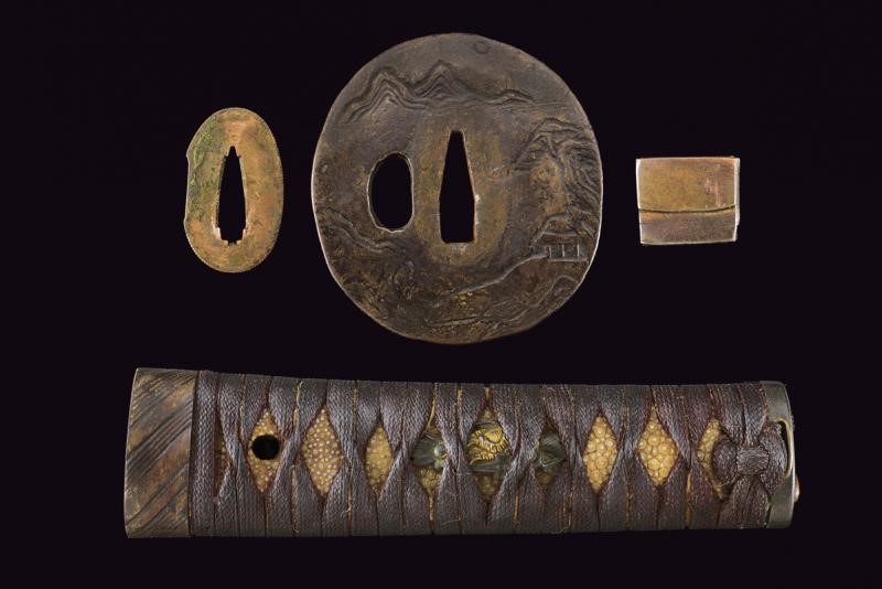 Shinogi-zukuri blade (nagasa: 36;5 cm), copper habaki. Nakago mumei with one mekugi-ana. Tsuba engraved with a landscape with a house, fuchi with oblique bands, kashira with floral motifs shakudo-inlaid. Only one of the menuki is still present. Saya made of black lacquered wood.