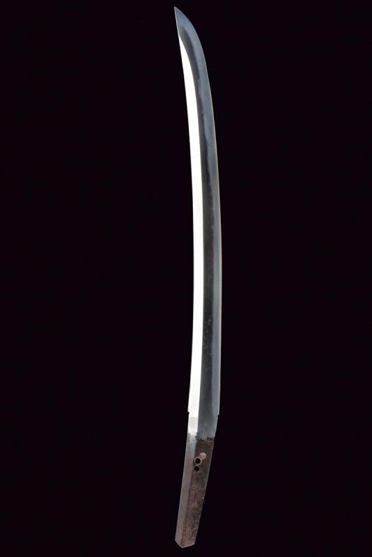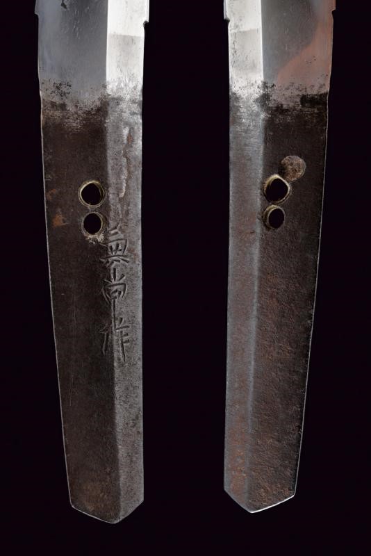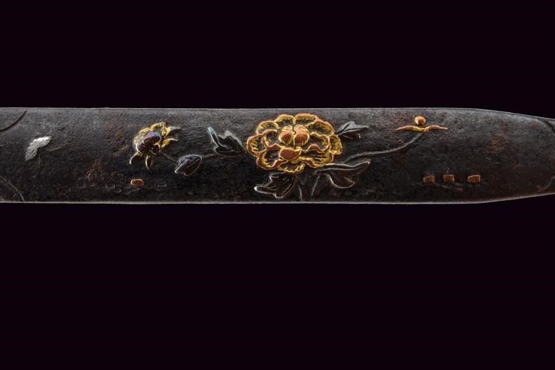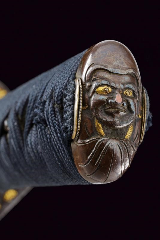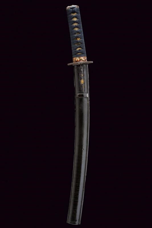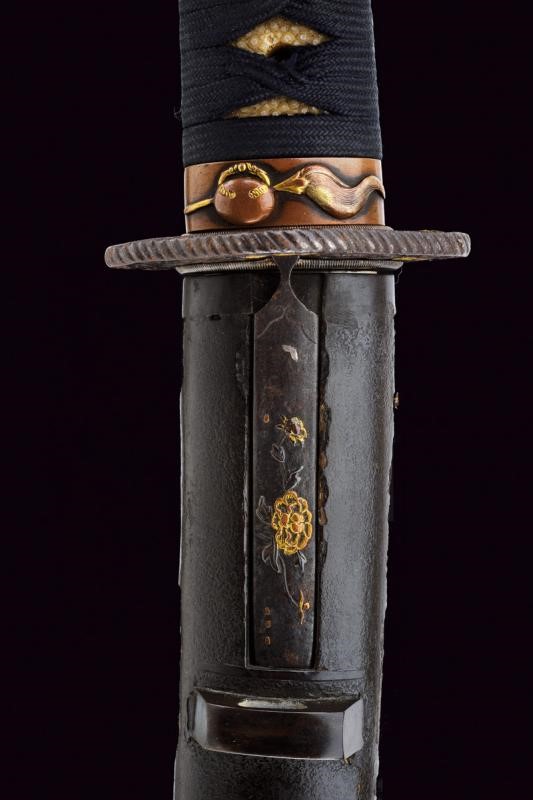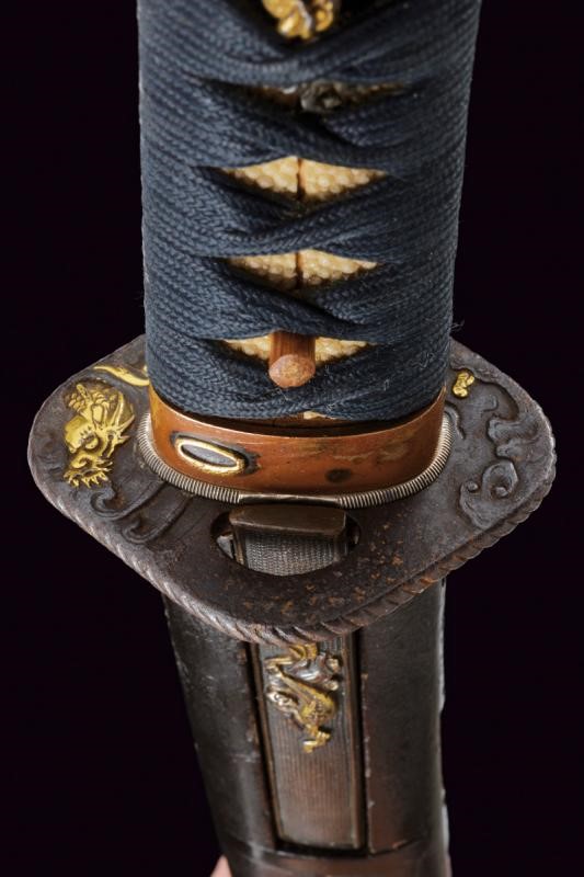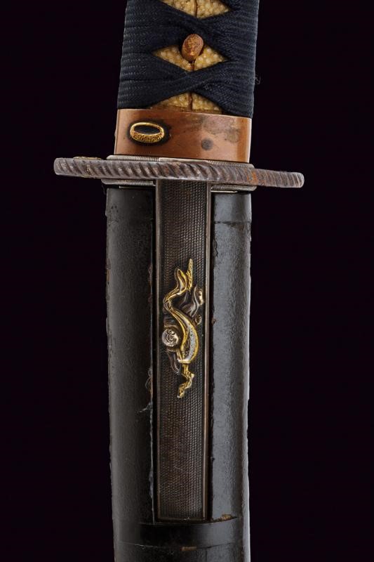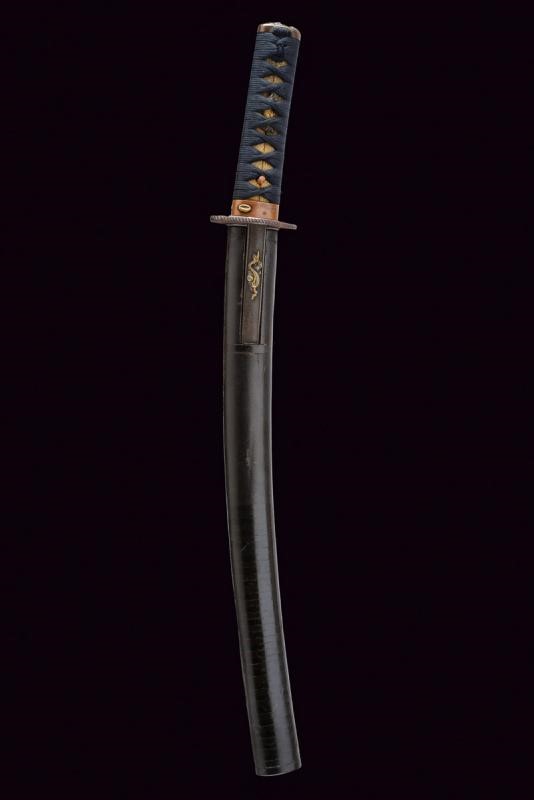 Nagasa: 38.2 cm, hada: dame nagare with masame, hamon: hiro suguha with gunome midare togari, silver habaki. Nakago mei Kane Tsune Saku, with two mekugi-ana. Beautiful otafuku-gata iron tsuba, decorated with a gold dragon among the clouds, the dimi with oblique notch decoration. Shakudo fuchi with vegetables in relief with gold parts, kashira with a face with gold eyes and nose. Complete with black silk menuki and tsuka-ito. Lacquered wooden saya (missing parts) provided with kozuka and kogai, also finely decorated.