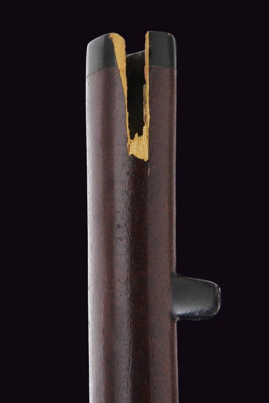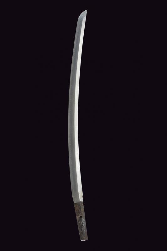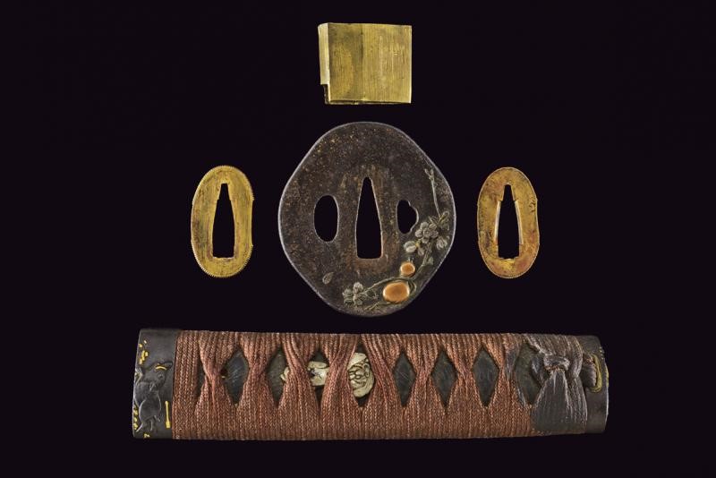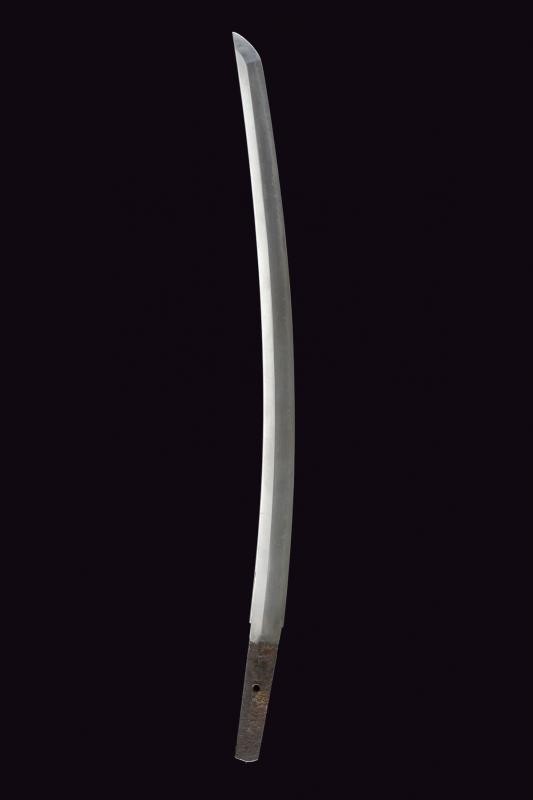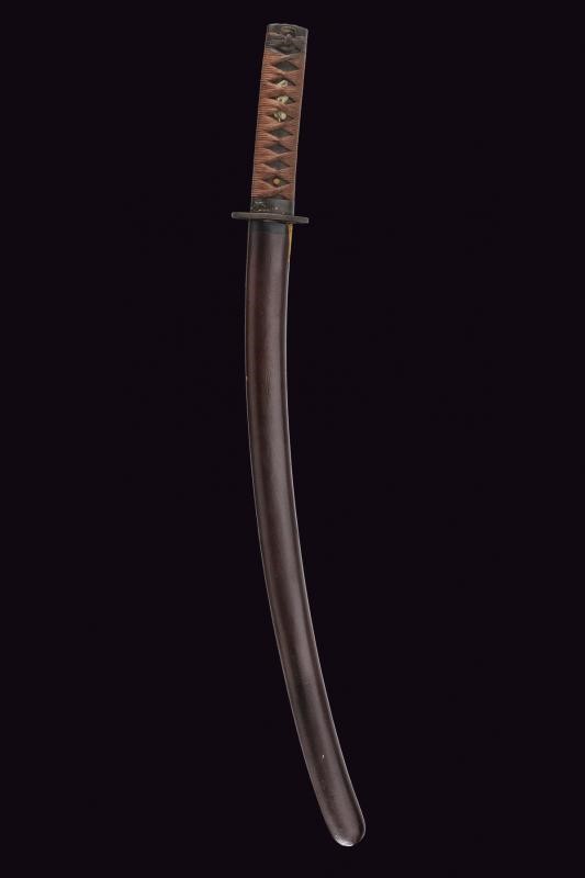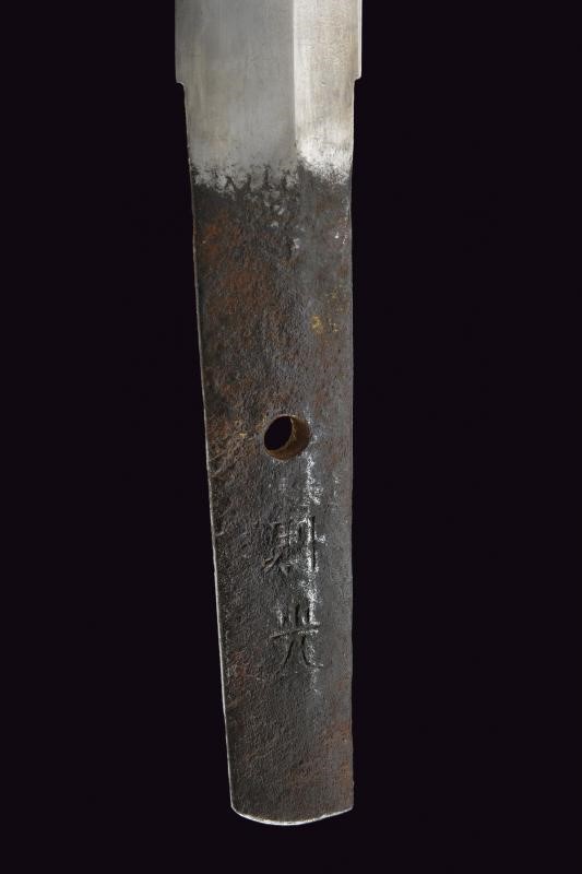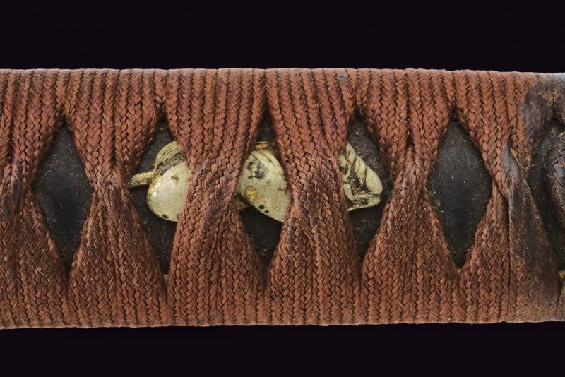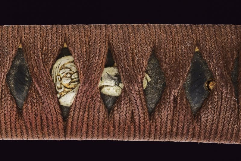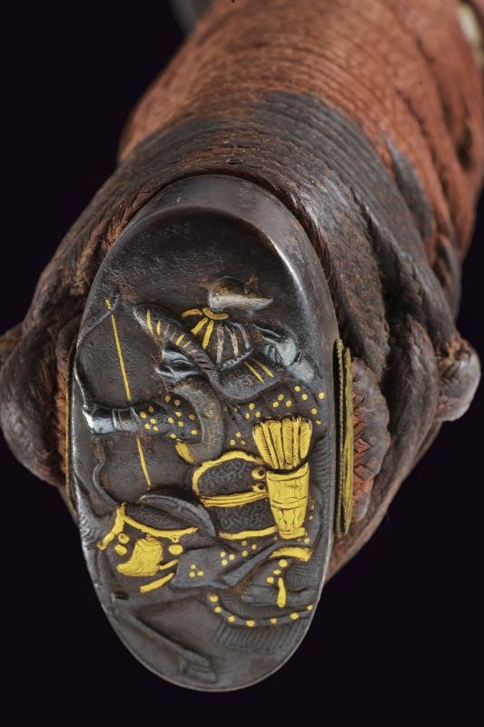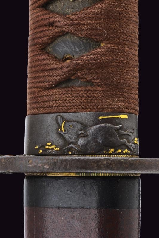 Nagasa (length: 49,4 cm), hamon: Gunome Midare Togari, small defect on the back, brass habaki. Nakago mei Nori Mitsu with a mekugi-ana. Mino. Tsuba shaped as a otafuku-gata and decorated with floral motifs in bas-relief with silver-inlaid and shakudo. Fuchi with boar and hare, kashira with archer, menuki in light green stone (small missing part). Saya made of wood (missing part) lacquered in dark red.