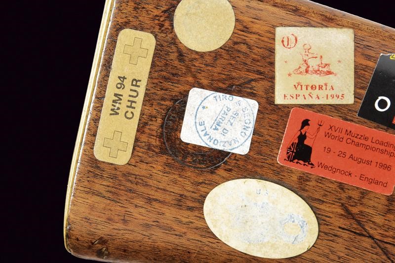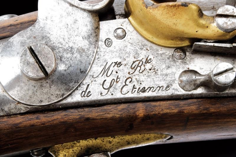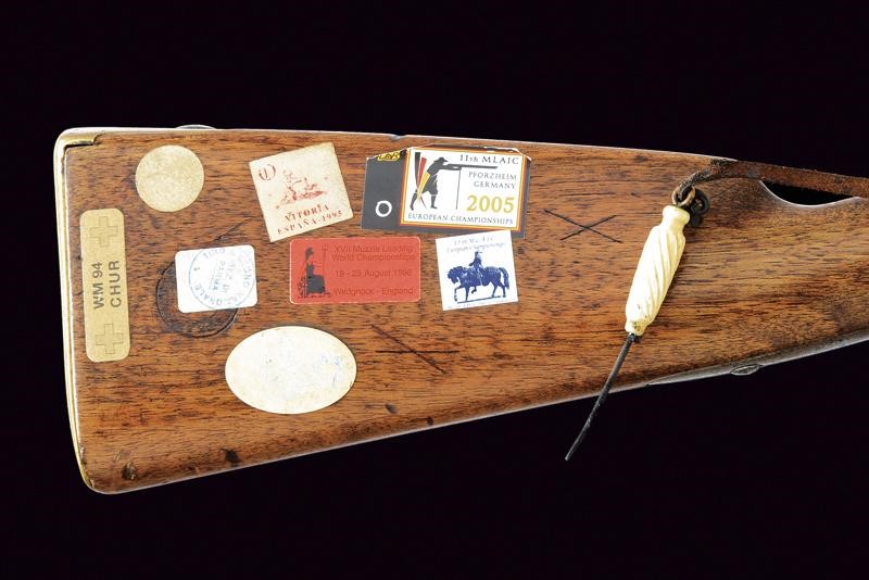 Round, smoothbore, 17 mm cal. barrel, octagonal at the base, clutch for the bayonet, base marked "V" and “D” under a crown; tang with pattern; flintlock signed "M.re R.le de St. Etienne" and with mark. Wooden full stock with brass and iron mounts with marks. Iron ramrod. On the right side, labels with participation in world and European championships.