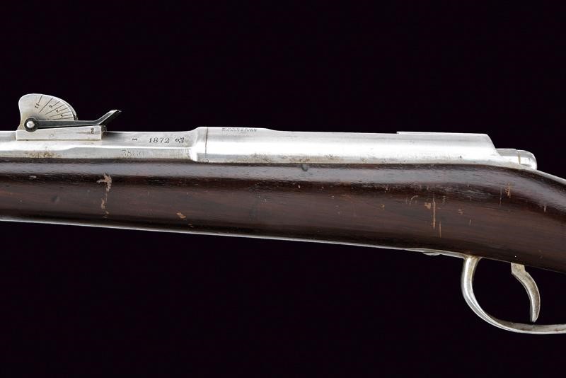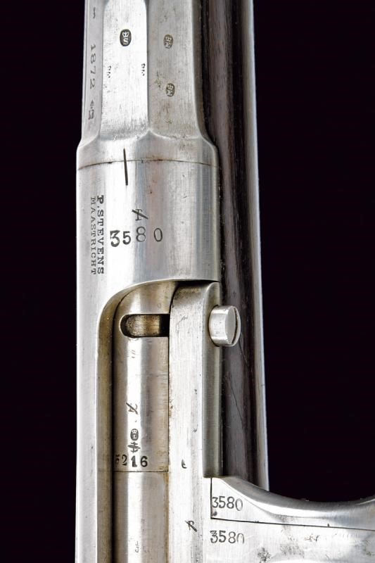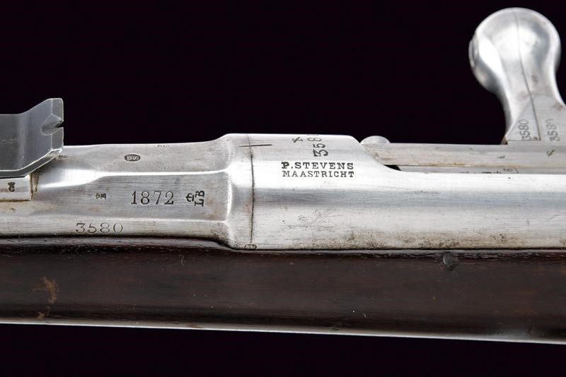 Round, rifled barrel (clean bore, visible rifling), octagonal breech featuring several marks, serial number "35xx" and date "1872"; provided with foresight, club guide for the bayonet and variable rear sight, 11 mm cal. at the nozzle. Working bolt action marked "P. STEVENS MAASTRICHT", with serial number and marks. Wooden full stock in good condition. Smooth iron mounts, butt-plate tang with matching numbering. Iron ramrod. Working mechanism.
