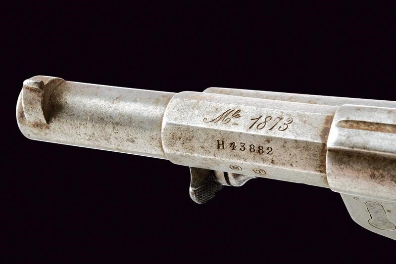 Two-stage, octagonal and round, 11 mm cal. barrel, provided with foresight, with the marks "S.1881", "M.le 1873", other marks and serial number “H438xx”; smooth, six-shot cylinder, marked with crowned "E" and with the same serial number. Frame featuring marks, serial number and "M.re d'Armes St. Etienne"; checkered, wooden grip scales, side extractor, lanyard ring. Working mechanism.