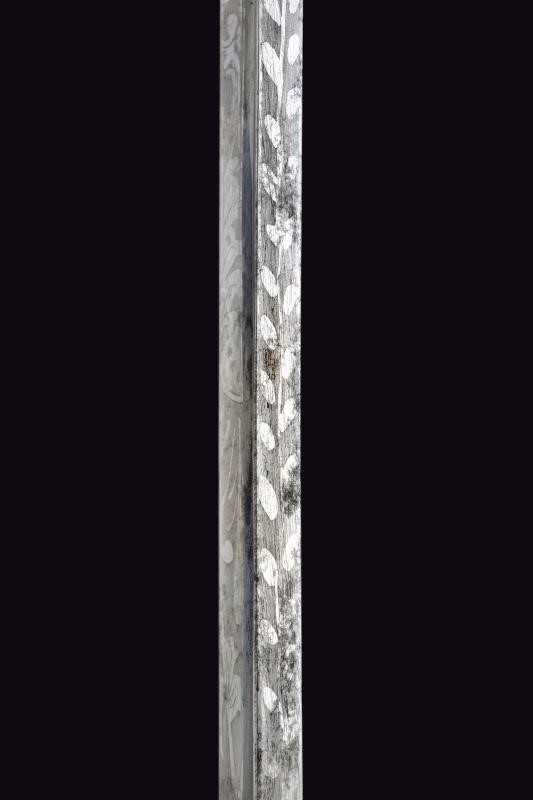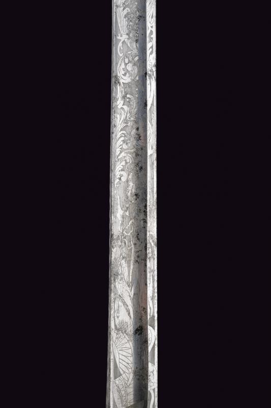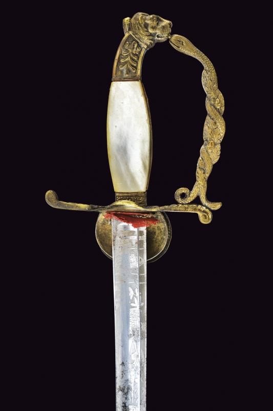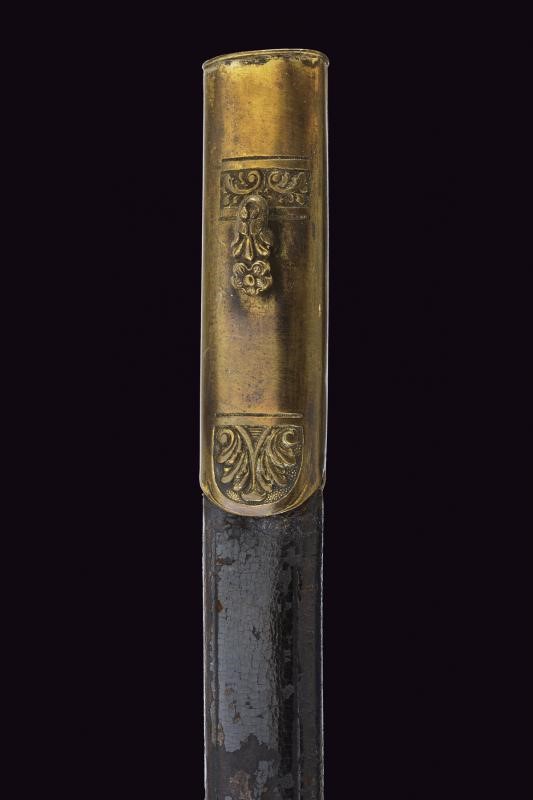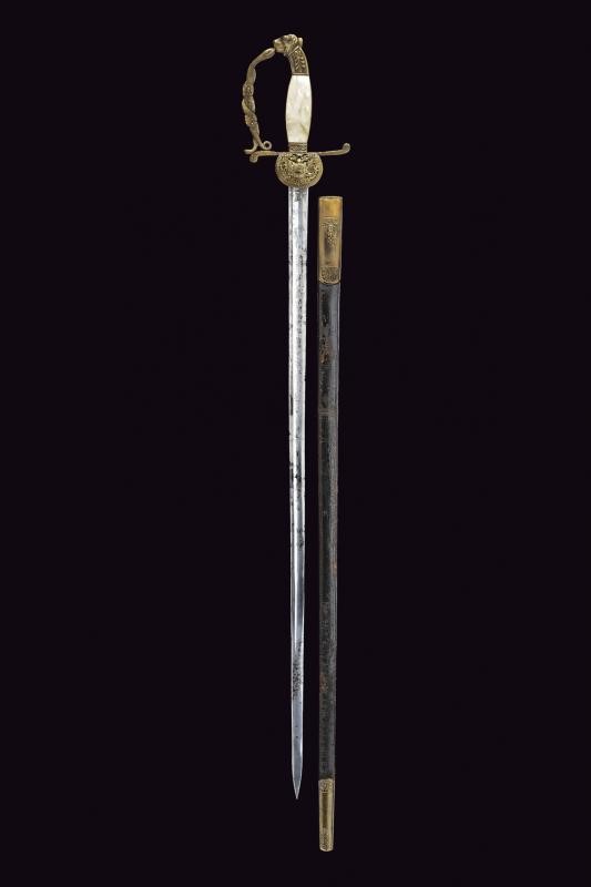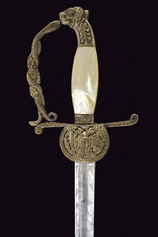 Tipped, single-and short false-edged blade, with fuller for a good part of its length, the first part engraved with a burin in trophy and floral motifs. Gilt brass hilt. Shell-guard with openwork imperial emblem in relief, snake-shaped guard with oak fronds, pommel with lion's head. Smooth, mother-of-pearl grip scales. Antique leather scabbard with brass mounts partially engraved with floral motifs.