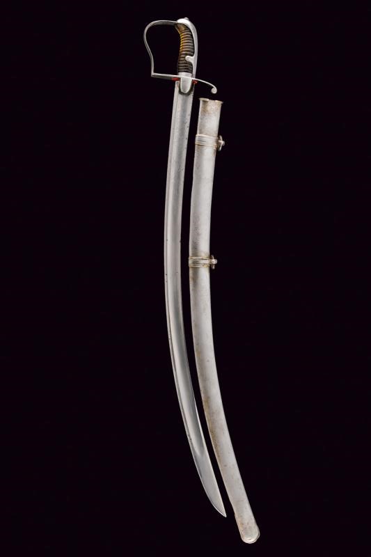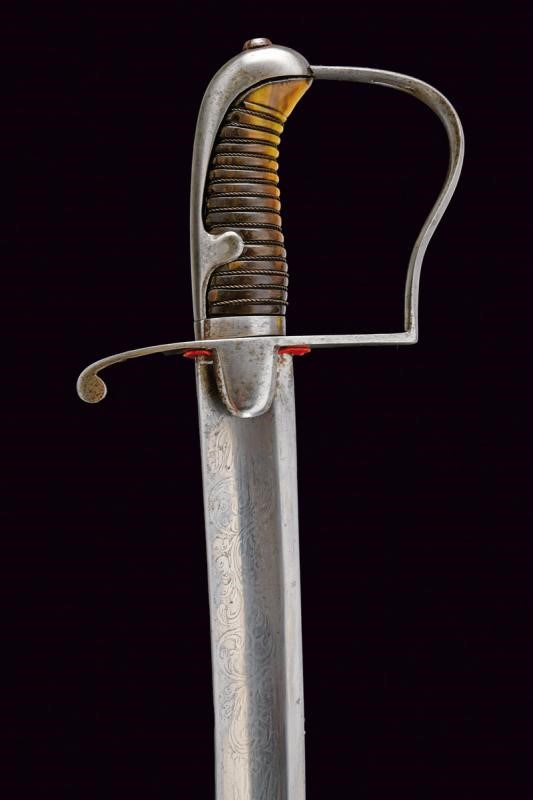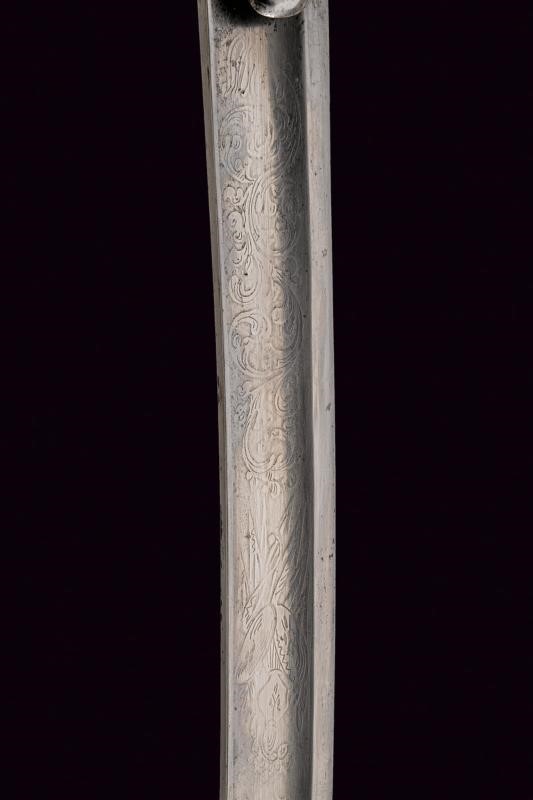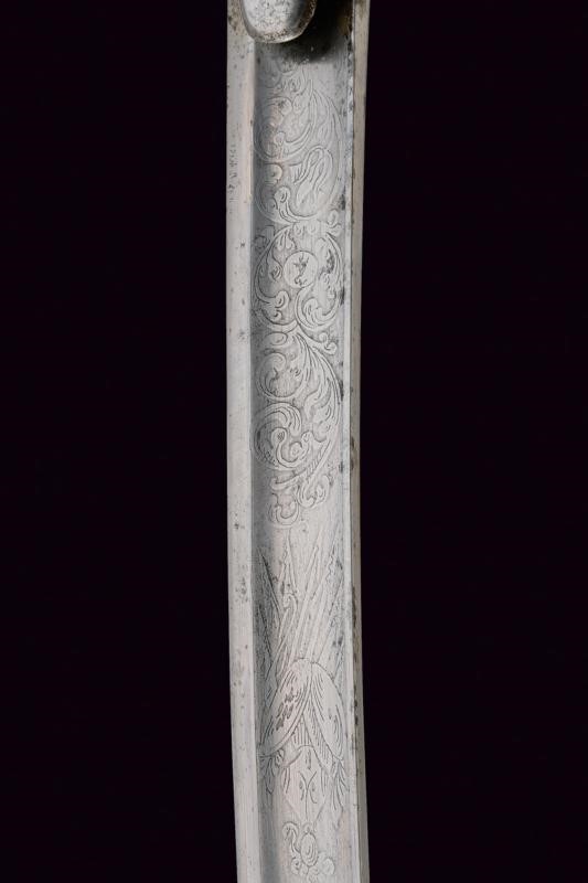 Curved, single-and-false-edged blade, almost totally with fuller, the base featuring still visible remains of floral spirals and trophy engravings. Iron hilt with stirrup guard, langets and curl-shaped parry quillon. Grip divided in horn sectors (small missing parts) with metal coil. Iron scabbard (small general defects) with two lugs.
