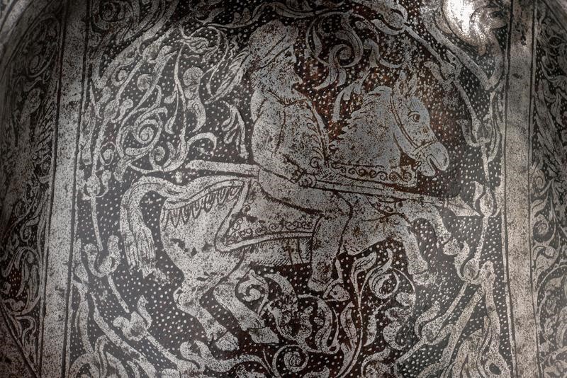 Iron skull worked in one piece with the brim. With a medium-high comb featuring a twisted edge at the top; sloping, pointed and ribbed brim with hemmed and twisted edge. The entire surface finely etched; on one side is a scene depicting the Biblical scene of the 'Sacrifice of Isaac' inside a round frame surrounded by birds and floral motifs on a granulated ground; on the other side is a knight on horseback decorated en suite. The comb with a depiction of a drummer and a standard bearer, both inside an ellipsis among birds. The base with a row of rivets provided with iron rosette (small missing parts). Flaking and remains of leather strings inside.