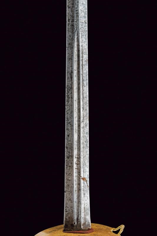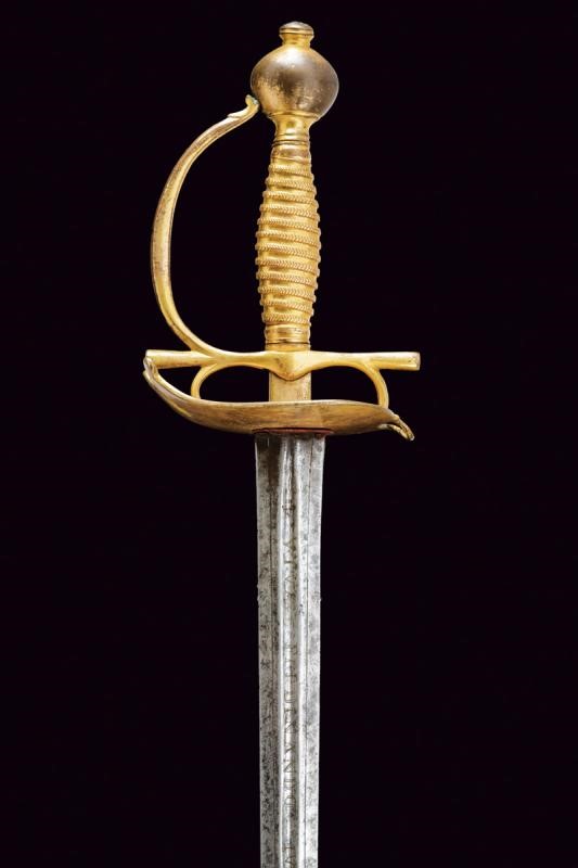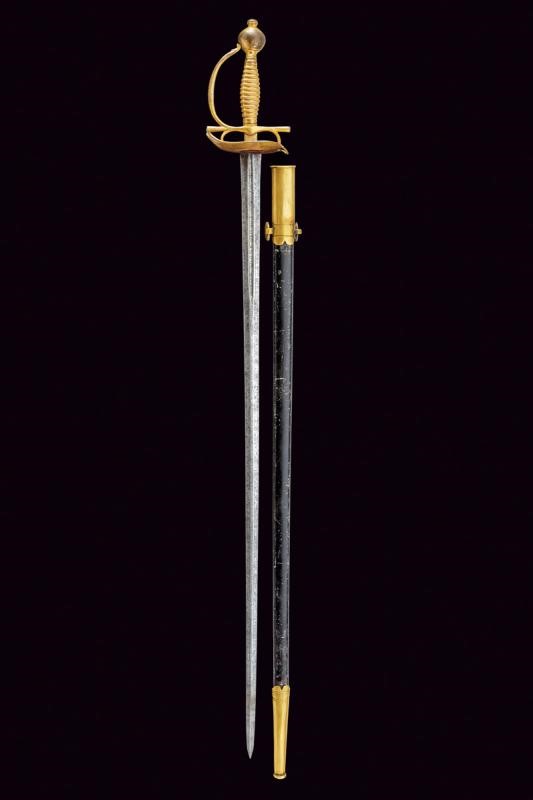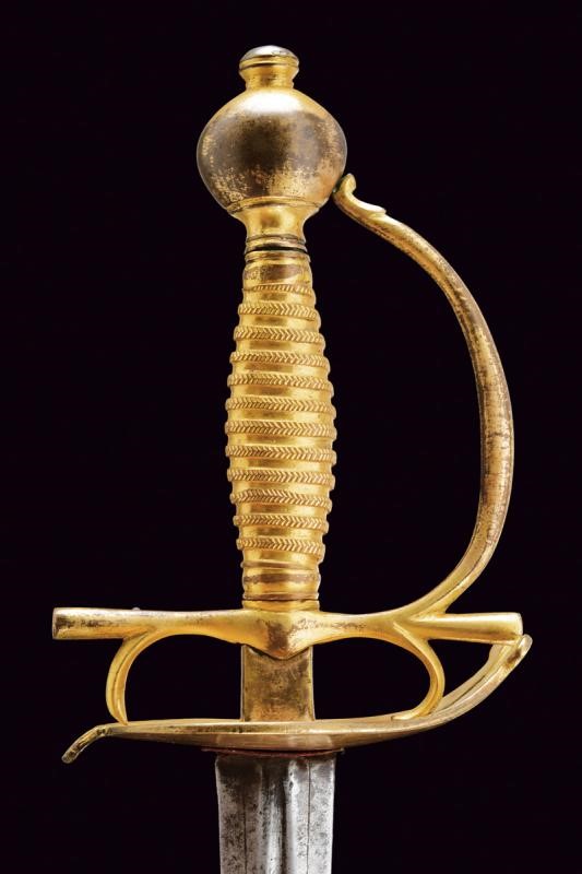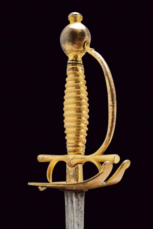 Straight, double-edged blade of hexagonal section, the base with fuller on both sides and with the inscription "VIVA FERDINANDO IV / REY. POR LA GRACIA DE DIO.". Gilded bronze hilt (missing parts of finishing) with heart-shaped rain guard, straight quillons and two arms of the hilt. Flattened, spherical pommel with button. Gilt bronze foil grip worked to imitate the wire binding. Black washed iron scabbard (missing areas of color), cap and chape made of gilded brass, the first with two lugs.