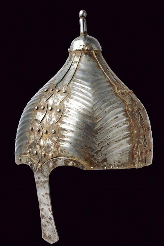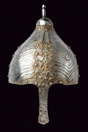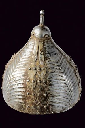 Made of iron, with large cup decorated with wings in bas-relief, the top with small riveted dome with short, cylindrical cusp ending in a sphere. The front with nosepiece, the four sides with double riveted bands. The base with holes for a mail neck-defense. 19th century or earlier.