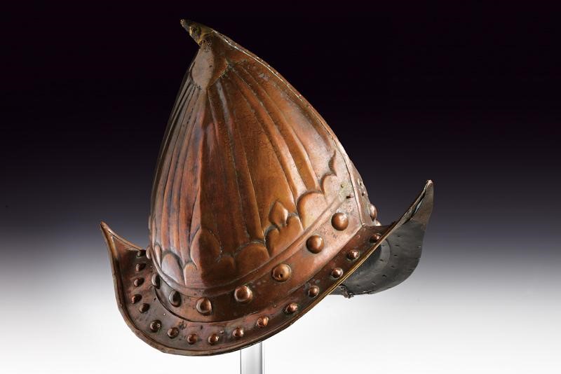 Entirely made of copper, with skull divided into two riveted halves, the top made of brass featuring carved and turned backwards axe, the surface decorated with grooves and floral decorations. The brim riveted at the skull, with raised border and row of rivets. Inside remains of two hooks for the chin-strap. Rare.