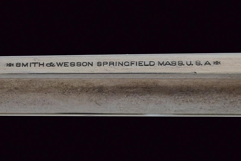 A 6-1/2" rifled barrel, swivelling, with rib featuring foresight with the company mark of the second type (single line and no patents), calibre 44 Russian (10.7 mm cal. at the nozzle, chamber diameter 11.5 mm at the base). Clean bore, in good condition with some signs of use and visible rifling. Grooved, six shots cylinder. Precision frontsight and adjustable rear sight. Frame with manufacturer's monogram. Working mechanism. Matching serial number "32xxx" on barrel, hook, cylinder and grip. Checkered hard rubber grip scales with "SW" monogram. In excellent condition, it keeps approximately 95% of its original browning. Cock and trigger guard with antique casehardening.