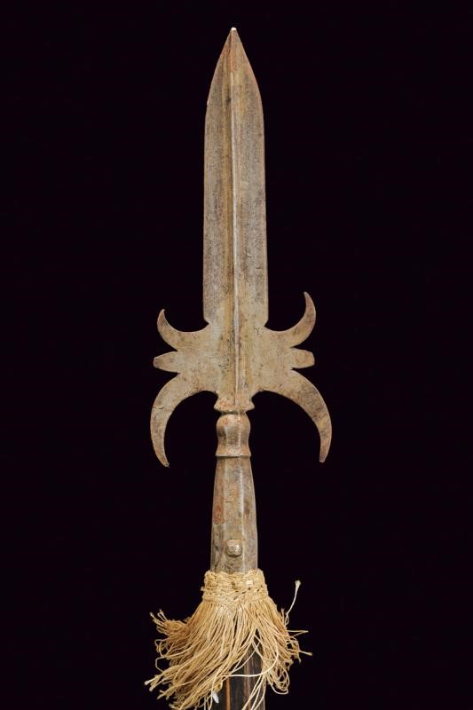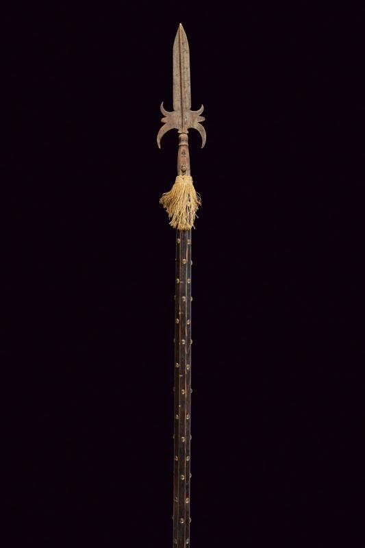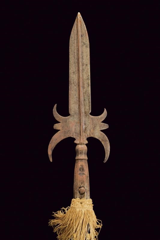 Spearhead with blade cusp, provided with triple wings at the base, the lower ones very elongated downwards. Ferrule of octagonal section, ending in a knot. Wooden shaft (decorated with small studs) and tassel, probably later.