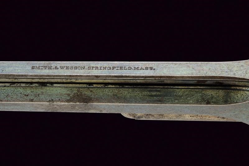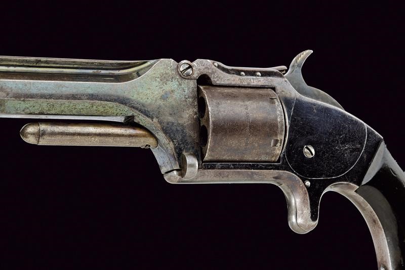 6", octagonal rifled barrel, equipped with a white metal semicircular front sight mounted on the rib, stamped “SMITH & WESSON SPRINGFIELD MASS.” Caliber 32 rimfire long. Smooth six-shot cylinder bearing patent markings legible up to 1860. Barrel tilts upward for loading. Frame retains approximately 40% of the original antique blue finish. Spur trigger. Serial number “15xxx.” Rosewood grips. Working mechanis. Cylinder and barrel with matching assembly numbers.