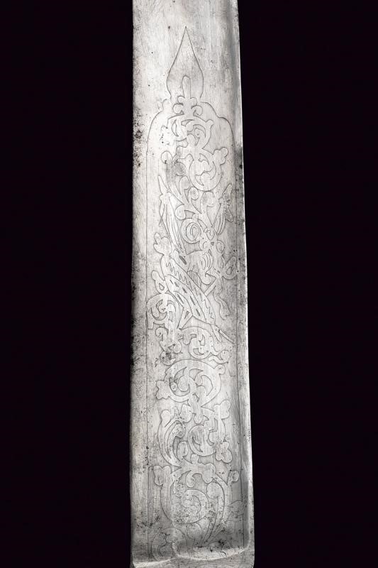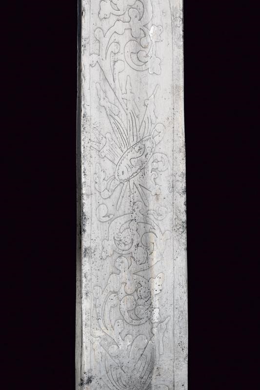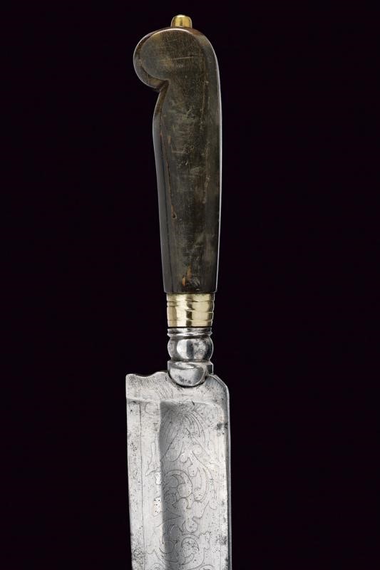 Large, straight, single-and false-edged blade with wide fuller, etched with trophies and floral motifs. Faceted, brown horn handle (small missing parts and a crack). White metal ring nut. Leather scabbard with metal hook, missing chape.