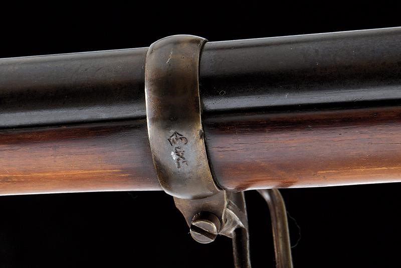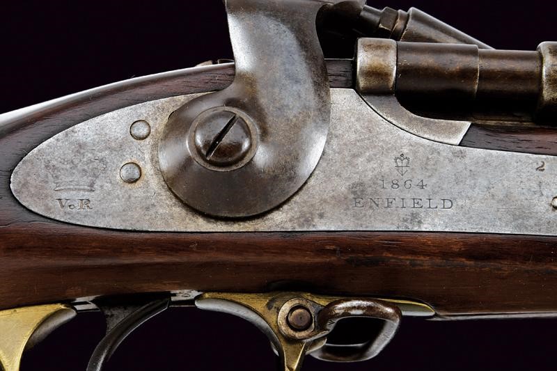 Round, rifled, 14 mm cal. barrel (clean bore, clearly visible rifling), with British and "Steel" marks at the base, adjustable and foldaway rear sight, foresight. Typical opening bolt marked "WD" and with marks, working mechanism. Forward spring lock dated "1864", marked "ENFIELD", "VR" under crown and with marks. Wooden, full stock. Brass mounts. Iron ramrod.