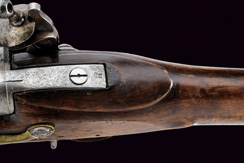 Smoothbore, round, 18 mm cal. barrel, the base with round frame and marks of the test bench (GR under crown), foresight (which also serves as a clutch for the bayonet); tang marked "14" under crown. Flintlock marked "GR" under crown, "TOWER" and with broad arrow. Lock plate and cock borders with double lines. Wooden, full stock (restorations at the front of the stock) with smooth, brass mounts. Iron ramrod and socket bayonet (length 48.5 cm).