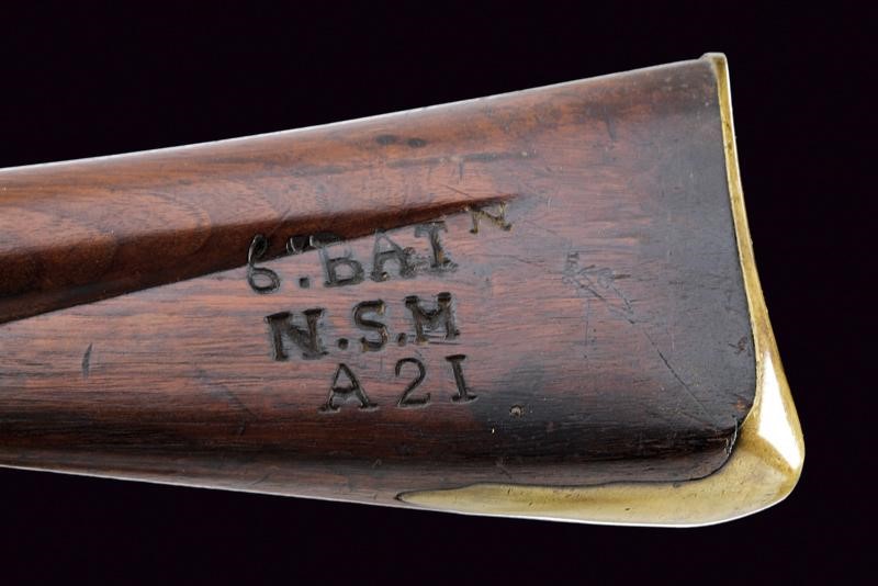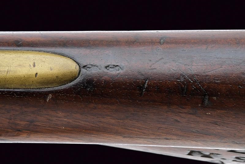 Smoothbore, round, 18 mm cal. barrel, the base with round frame and marks of the test bench (GR under crown), foresight (which also serves as clutch for the bayonet); tang marked "9" under crown. Flintlock marked "GR" under crown, "TOWER" and with broad arrow. Cock borders with double lines. Wooden, full stock (crack in front of the trigger guard), butt marked "6 BATT.N / N.S.M / A 2I". Smooth, brass mounts. Iron ramrod and bayonet (length 56 cm).