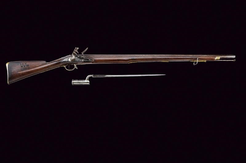 A Brown Bess flintlock gun with bayonet
