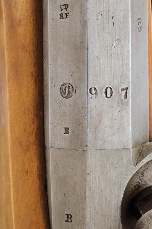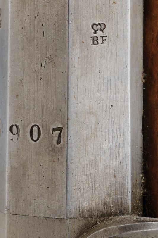 Rifled, round, 9,5 mm cal. barrel (clean bore, visible rifling), with octagonal base marked "BF" under crown, "B", "P" and numbered "907", foresight; long, smooth tang; forward spring lock signed "BEURET FRERES LIEGE" and marked "BF" under crown; full stock made of light wood and iron mounts and ramrod. Probably never used.