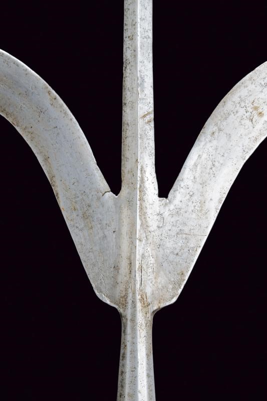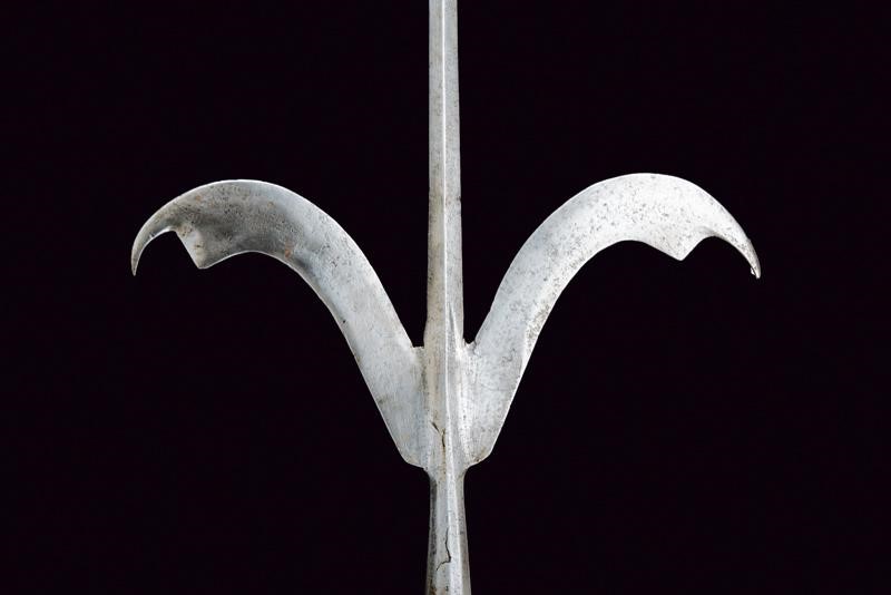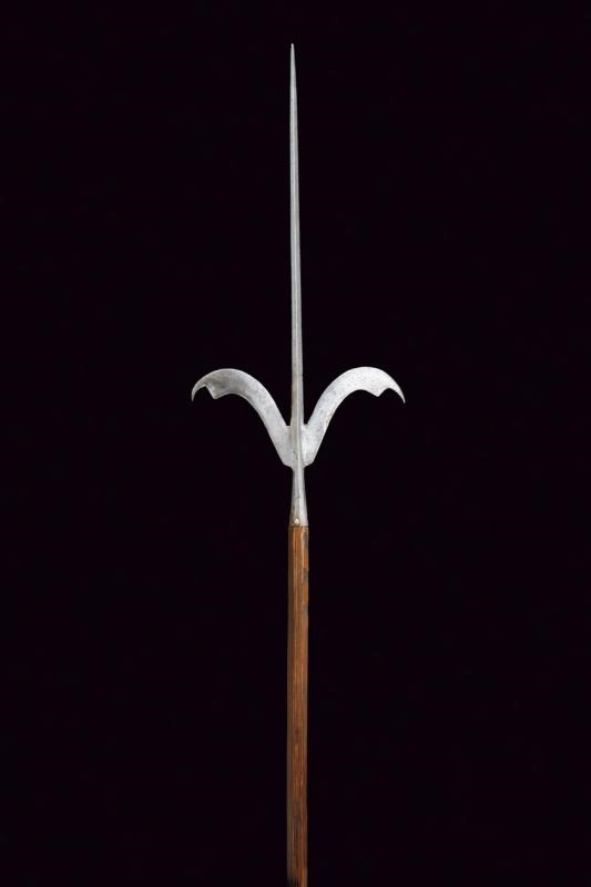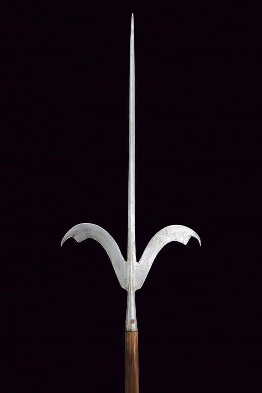 Straight, cusped spearhead of lozenge section, with curved lugs (small damaged parts) and cusps at the edges. Short ferrule shaped as a truncated cone and slightly faceted. Without straps. On an octagonal wooden shaft of recent production.