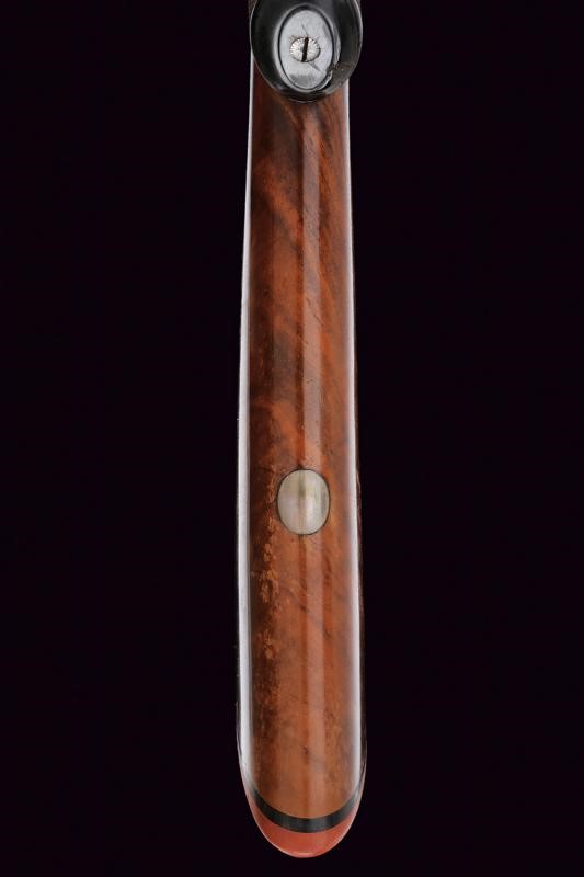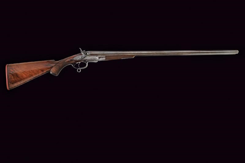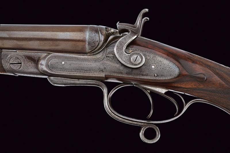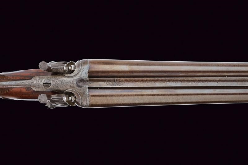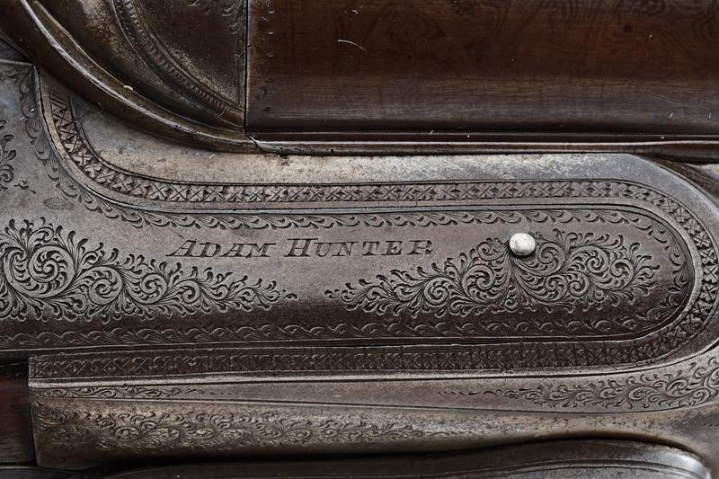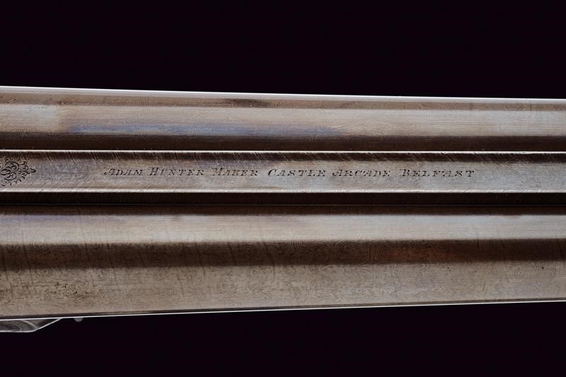 Smoothbore, round, 12 gauge barrels, (clean bores), browning with damascus pattern, the rib signed "ADAM HUNTER MAKER CASTLE ARCADE BELFAST", engraved at the base and with foresight. Tang finely engraved with floral motifs; forward spring locks signed "ADAM HUNTER" and decorated en suite as are all the mounts. Butt and fore-end made of briarwood with hand support and checkered grip. Lower lever. Serial number "1xx". Good quality.