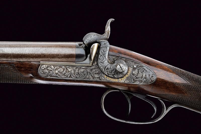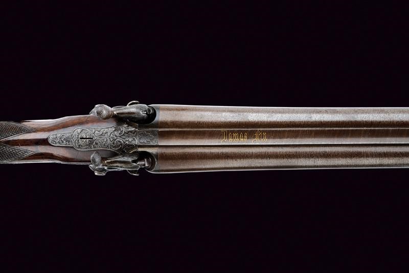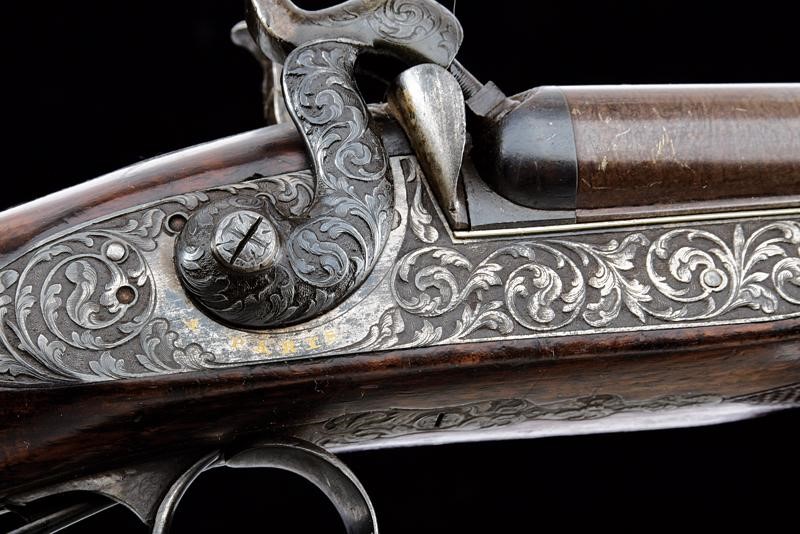 Browned, smoothbore, round, damask, 17 mm cal. barrels, engraved with leaves at the base with foresight, the rib marked "Damas Fin" in gold and provided with foresight. Tang finely engraved with floral motifs. Forward spring flintlocks signed "LEPAGE FRERES" and "A PARIS" in gold, engraved en suite with the tang. Wooden half stock with checkered palm rest and grip. Hilt worked in the typical way. Metal-tipped, wooden ramrod and iron cartridge extractors.