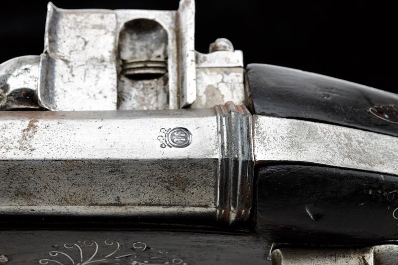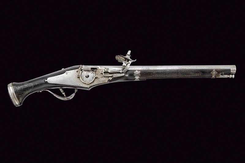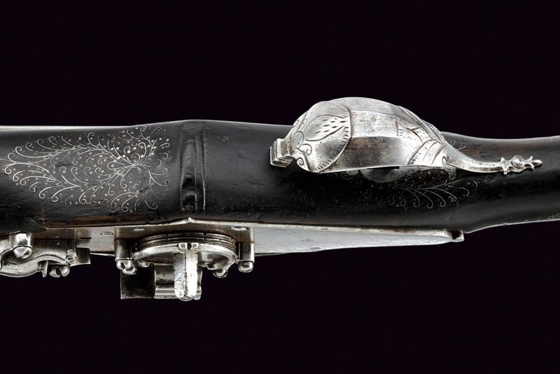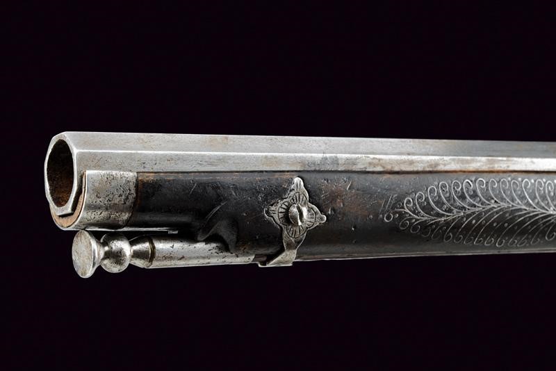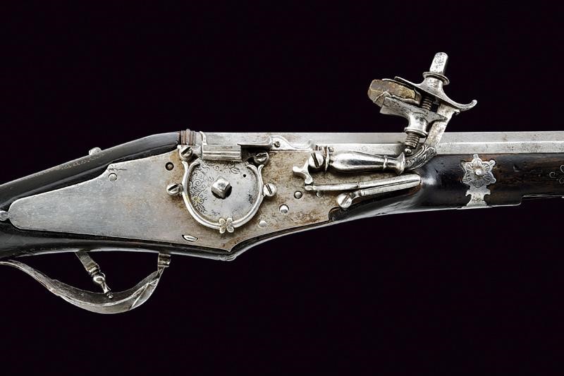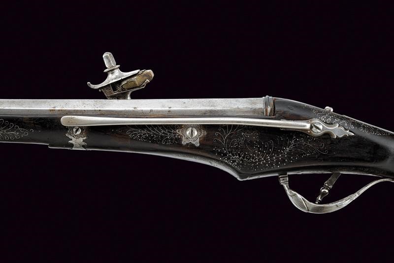 Long, smoothbore, octagonal, 14 mm cal. barrel, slightly tapering towards the nozzle, breech with the Ferlach's control mark and decorated with a frame. Lock with external wheel slightly engraved with floral motifs, flat rhomboid lock-plate, cock with tapered body, corner piece carved with floral motifs, base of rectangular section, sliding pan cover, with a mark shaped as a double arrow inside. Black, walnut full stock. Beautiful filigree inlays with racemes and geometric motifs on almost the entire wooden surface. Iron mounts, three-sided trigger guard slightly carved and engraved. Iron-tipped wooden ramrod. Belt hook.
