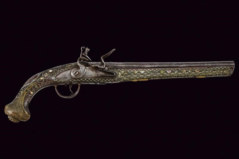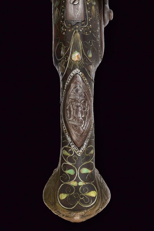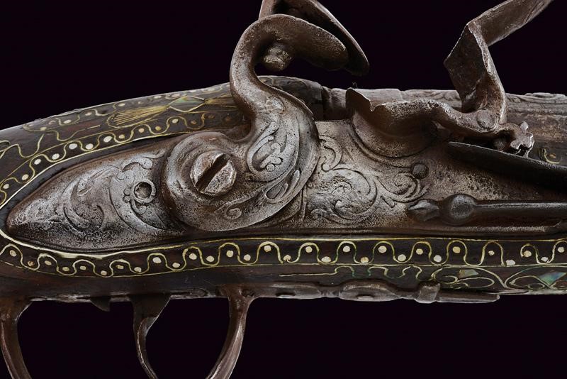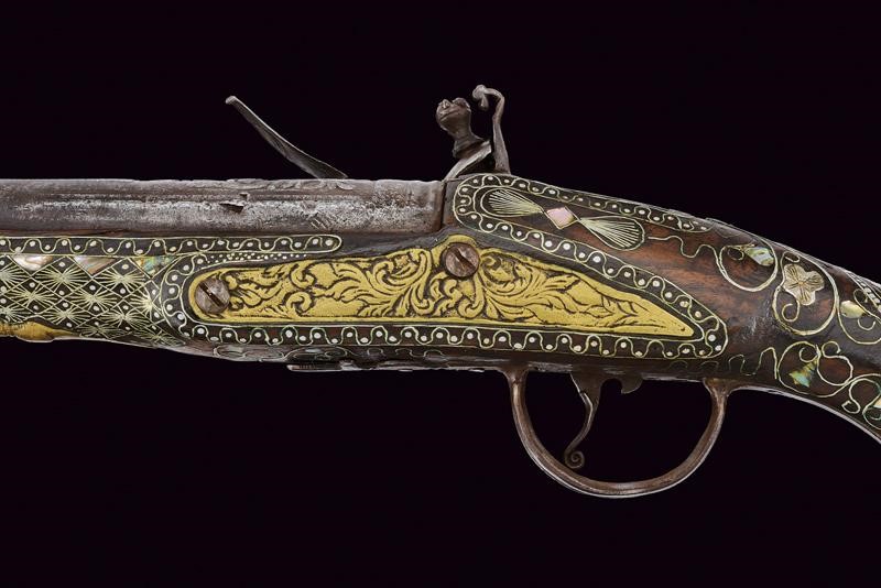 Round, smoothbore, iron, 16 mm cal barrel, with slightly bell-mouthed nozzle and floral carvings at the base; the rib gradually lowers towards the nozzle; breech with rings and remains of engravings. Tang with broad sight. Flintlock (18th century European manufacture?) with rounded plate featuring remains of raceme carvings. Hard but working mechanism. Wooden stock of Oriental manufacture with typical integrated fake ramrod. The surface richly decorated with silver-coloured metal inlays depicting geometric motifs, alternating with mother-of-pearl inlays. Iron trigger guard. Brass butt-plate with mask and floral motifs. Brass counter plate with floral decoration. Rear escutcheon made of iron with carving (possibly with Islamic characters).