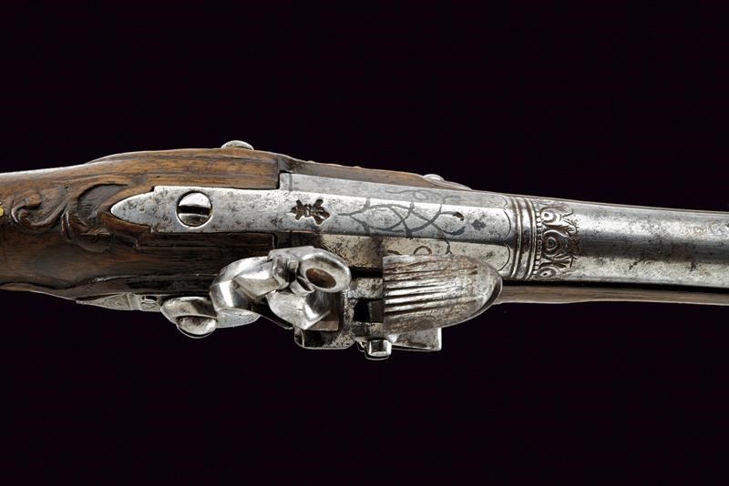 Smoothbore, two-stage barrel octagonal at the first segment with remains of silver inlays and with a mark on the back, featuring an acanthus-leaf frame at the girdle, 14 mm cal at the nozzle. Lock engraved with floral motifs and rocaille. Slightly-carved, wooden full stock, brass mounts, smooth escutcheon on the back, brass-tipped wooden ramrod.