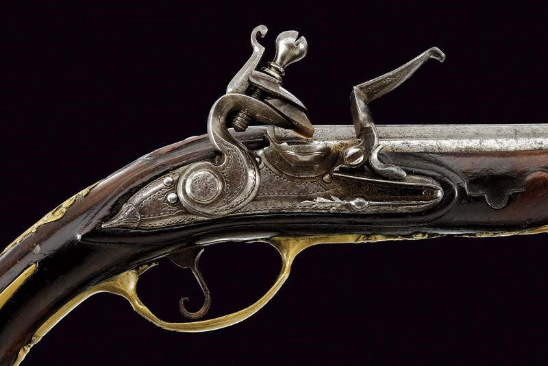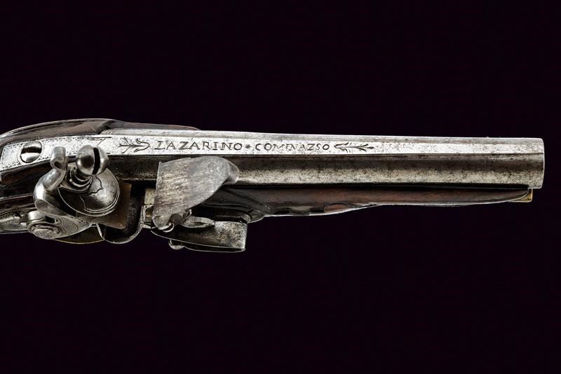 Round, smoothbore barrel with dorsal rib marked "LAZARINO COMINAZSO", decorated with small frame on the breech, 11.8 mm cal at the nozzle. With frames also on the tang. Lock with flat plate featuring oblique edges, engraved with frames. Full wooden stock with brass mounts decorated with floral carvings and engravings, the counterplate is partially pierced. With a crowned escutcheon on the back. Brass-tipped, wooden ramrod with iron cartridge extractors.