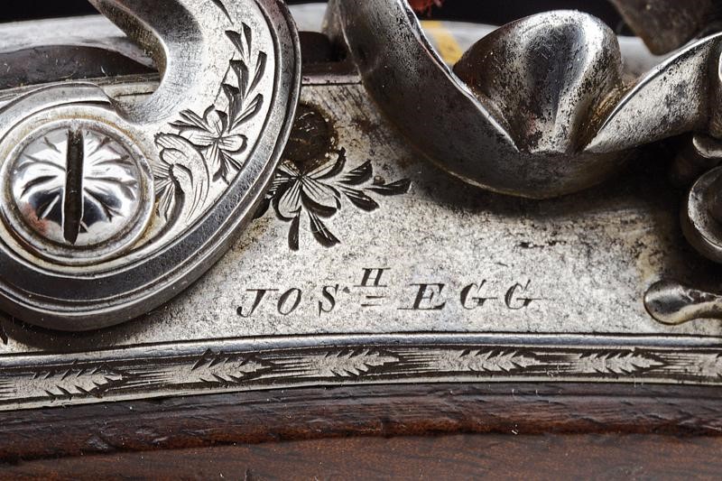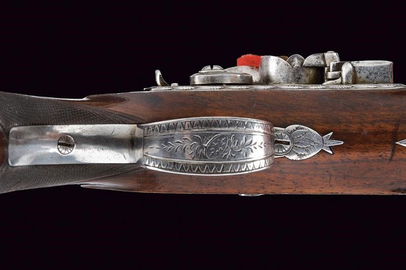 Smoothbore, round, 12 mm cal. barrel, with square base and short rib, with mark "LONDON", the first part with gold frame and band, after engraved with floral motifs and with foresight. Engraved tang with rear sight. Beautiful flintlock signed "JOS.H EGG" and engraved with floral motifs, provided with anti-friction and sealing systems, and safety lock. Wooden, full stock with checkered butt, engraved iron trigger guard, silver shield on the back. Iron ramrod.