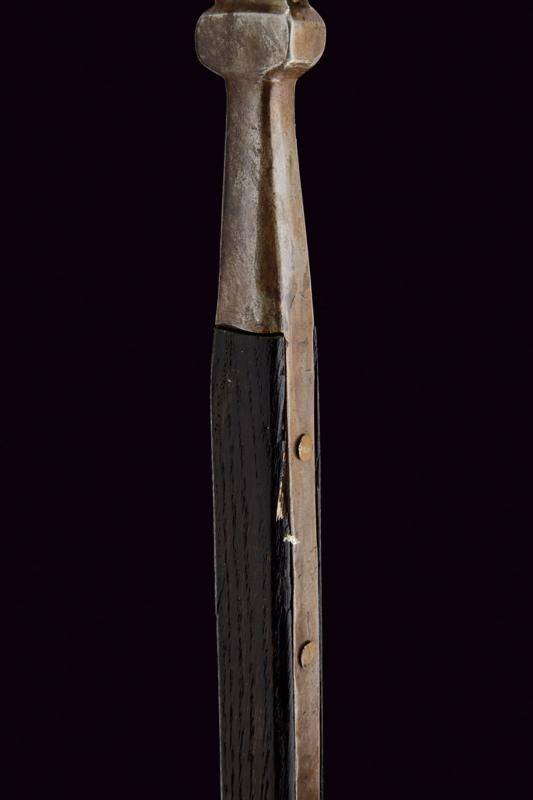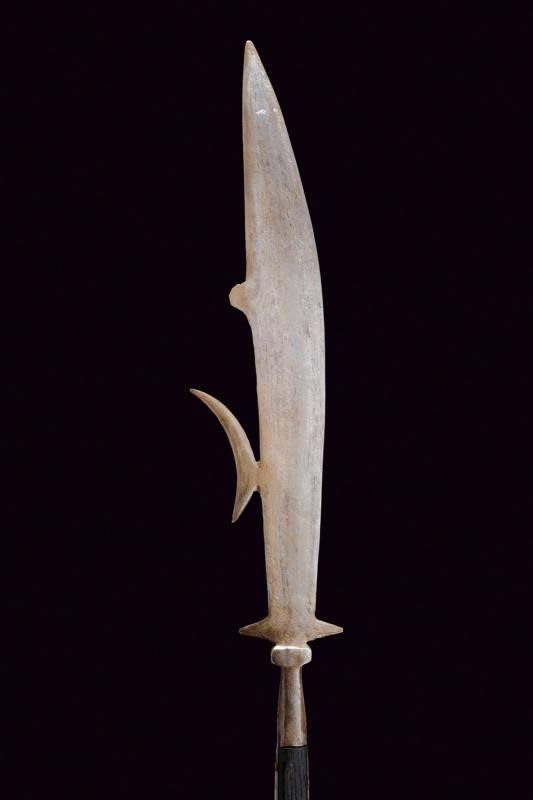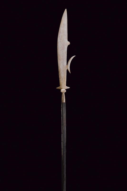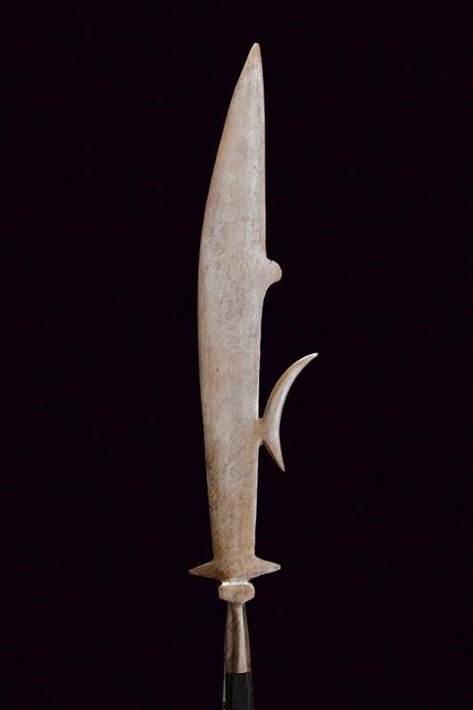 Long, iron, single-and-a-half-edged head (small defects), with a dorsal hump and crescent-shaped rest hook; the base with two other rests perpendicular to the spearhead. With a thick knot flattened at the centre and the ferrule of almost square section. Two long straps. Wooden shaft of recent production.