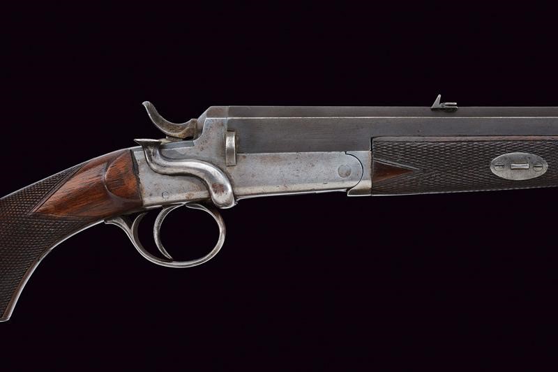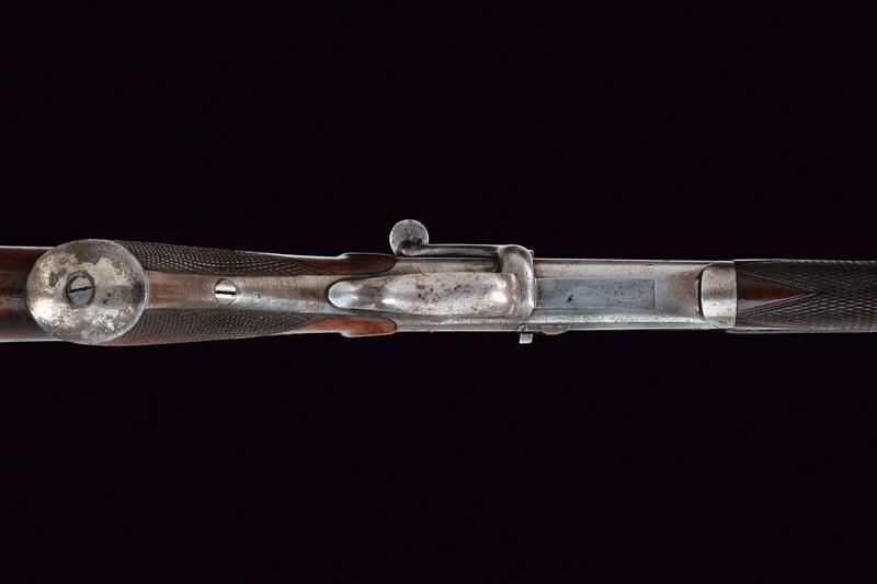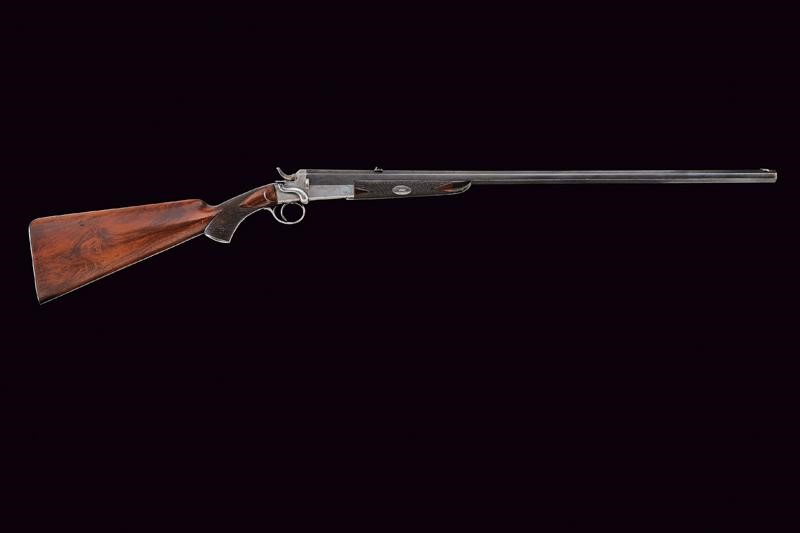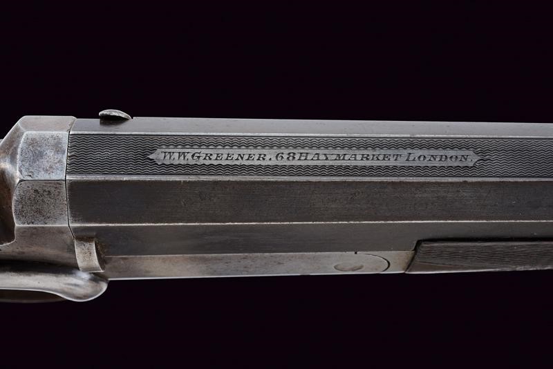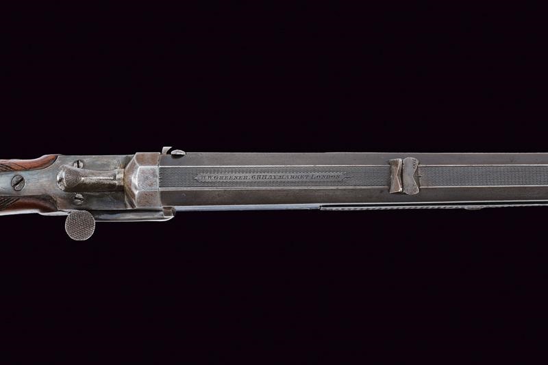 Rifled, octagonal barrel, provided with rear sight featuring two leaves for "50" and "100" yards, signed "W.W. GREENER 68 HAYMARKET LONDON" on the back, with marks of the Birmingham test bench at the bottom, 38 cal at te nozzle. Clean bore, visible rifling, small signs of use. Frame and receiver in one piece. Working mechanism. Knurled, wooden butt and fore-end. Iron mounts with few pitting. The lever to unlock the receiver is on the right side. Remains of antique finishing.