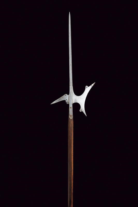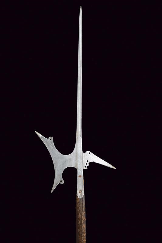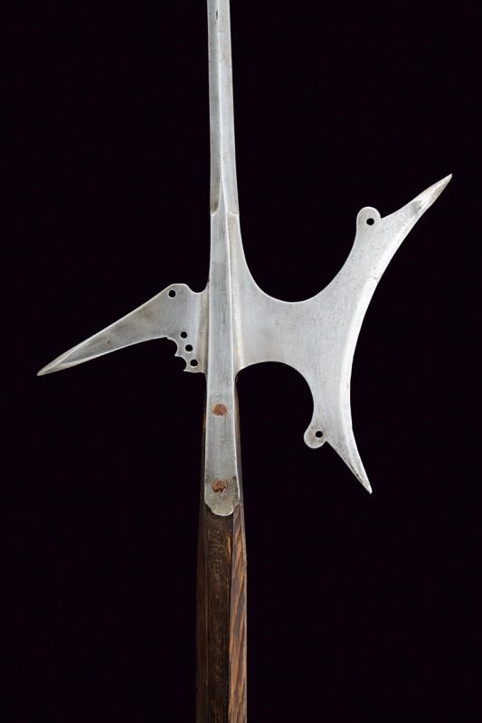 Long, iron cusp of lozenge section, rear fluke with reinforced tip and with four circular holes, convex axe with holes and one of the two tips reinforced. Shortened straps. On an octagonal wooden shaft of recent production.