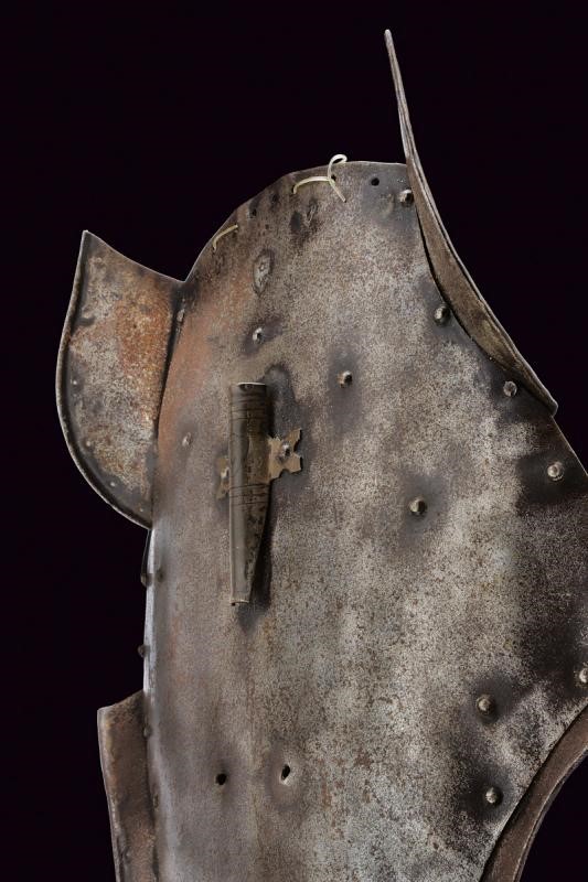 Made of iron, of well-moulded shape, complete with ear flaps and other plates fixed with rivets. A plume-holder at the center. The front part with air holes. The edges partially rimmed and engraved. With a shield-shaped mark with the letter 'W' at the top, and with remains of three other marks.