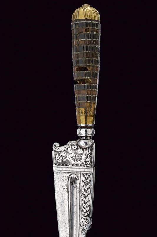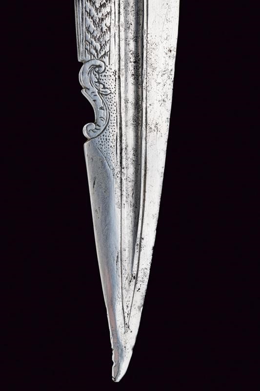 Triangular, single-and-false-edged blade with slightly raised tip, central groove, carved and ribbed back, the base engraved with floral motifs. Iron knot. Horn handle with disks (missing parts), engraved brass cap and ring nut. Leather-covered wooden scabbard with smooth brass mounts.
