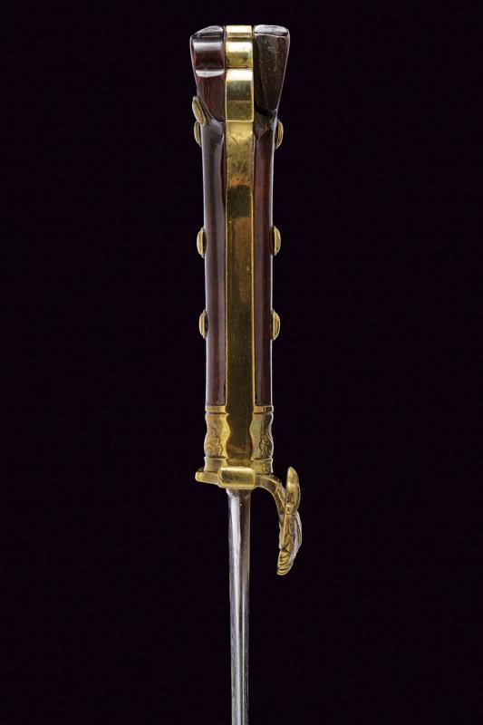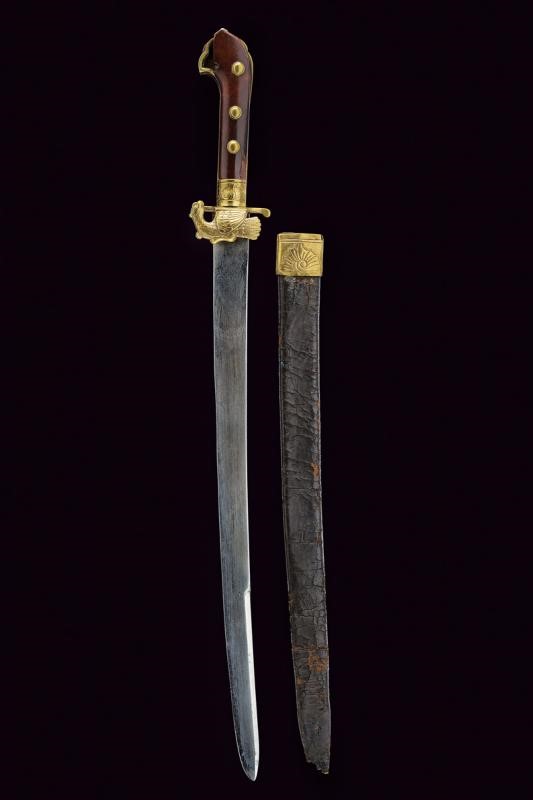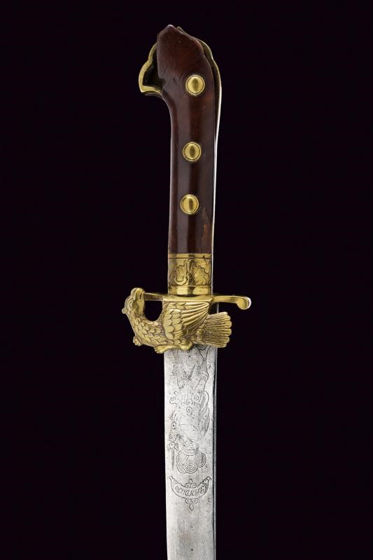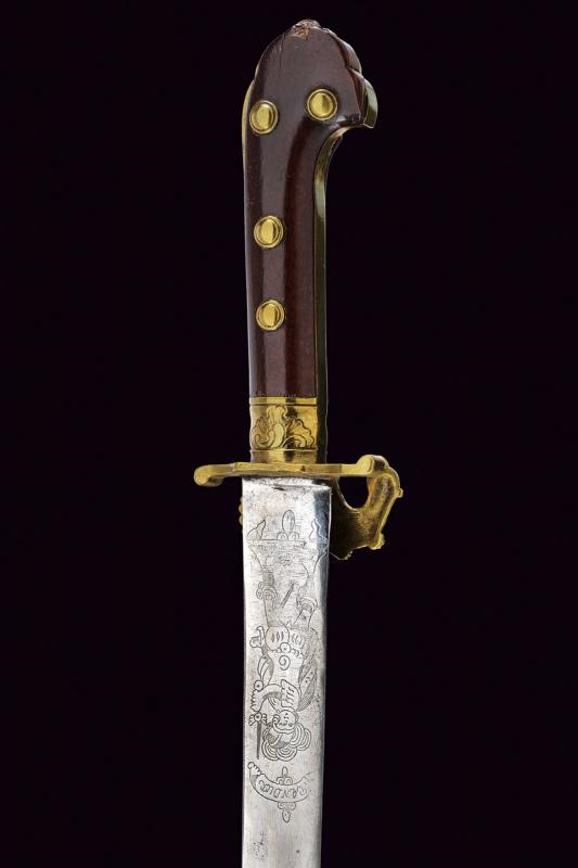 Slightly curved, single-and false-edged blade, the base engraved with a figure under the inscription "PANDUR", the back featuring the mark of a manufacturer from Presburg (partly legible). Brass mounts, the shell-guard shaped as a grouse, wooden grips (missing) parts with brass ring nut and rivets. Remains of the leather scabbard with brass cap, missing chape.
