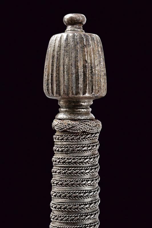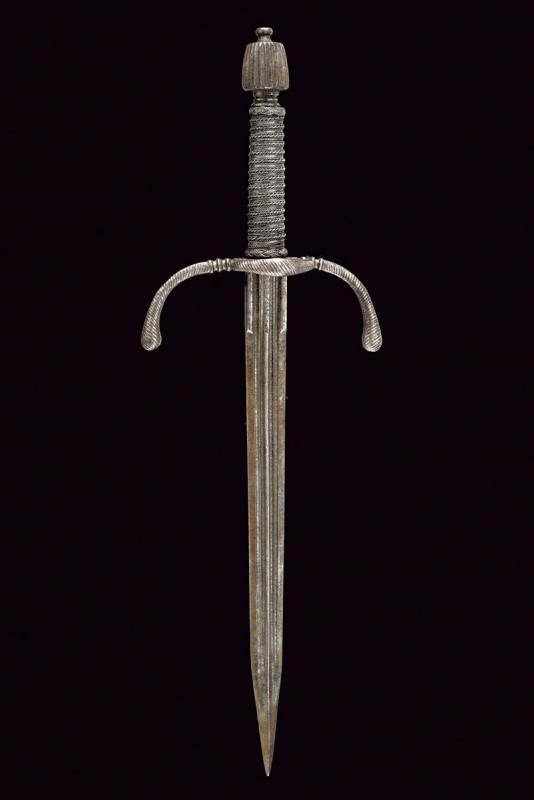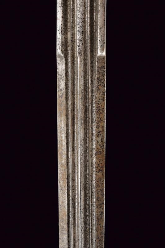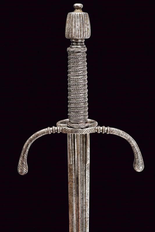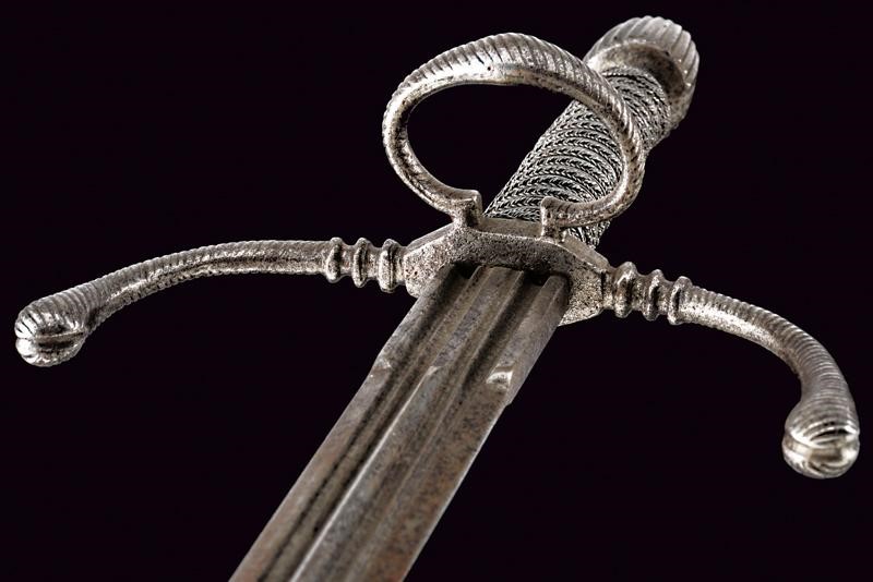 Straight, double-edged blade with ribs and grooves, the tang worked en suite. Quillon with quillons engraved and curved towards the blade and with drop-shaped ends. Parry ring decorated likewise. Pommel with longitudinal grooves, wooden handle covered with wire binding and Moor's heads (probably later).